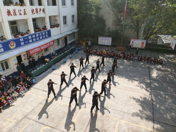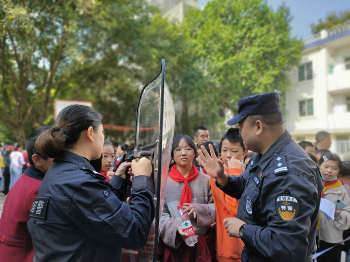 在警营,记者看到师生们观摩了多种先进的特战装备、器材;参观了警营文化建设和内务整理;大队民辅警还为师生们表演了队列、擒敌拳、擒敌技术、警犬搜索和个人技能等科目,充分展示了船山特巡警大队严谨的纪律作风和过硬的警务技能,让在场的师生大饱眼福,不时响起阵阵热烈的掌声。孩子们纷纷表示,要把在警营的所看所学牢记于心里,回校后写在文章里,让更多的小伙伴了解特巡警们为护卫我们的平安所付出的艰辛。