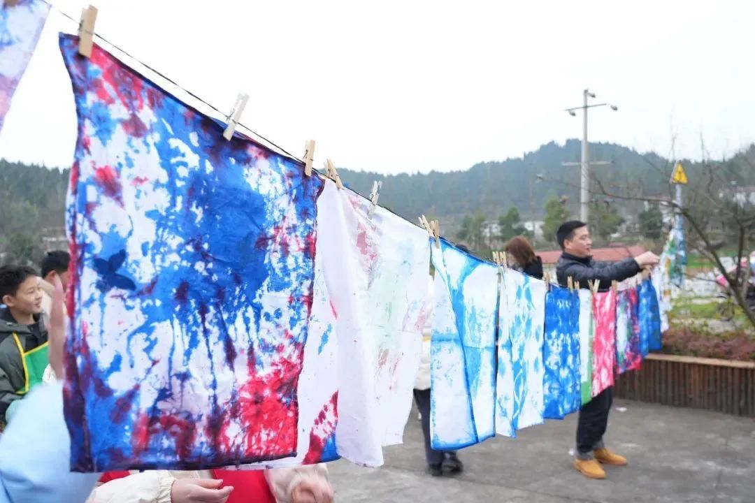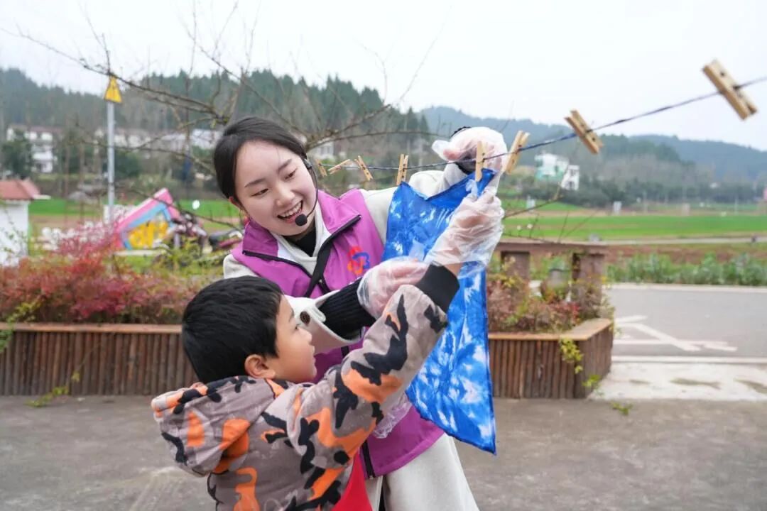 活动现场,孩子们为留守儿童送上新年礼物和祝福,巾帼志愿者讲述了扎染的溯源与发展,大家认真观看与聆听,展开了一次有趣的扎染体验。通过纱、线、绳等工具,对织物进行扎、捆、夹等多种形式组合并进行染色。在扎的过程中,细微的变化都能带来意想不到的效果,孩子们体验到融合艺术、化学、生物等多种学科的乐趣,制作出属于自己独一无二的扎染图案,感受到中国传统手艺“扎染”的神奇!