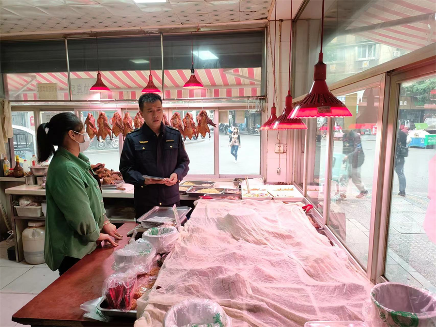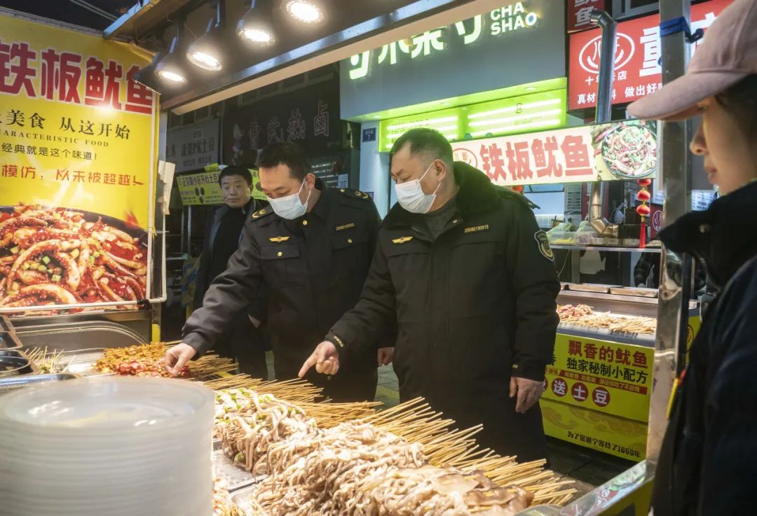2023年1月21日,船山区市场监管局工作人员在中心商业区小吃街检查食品安全。