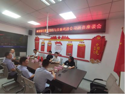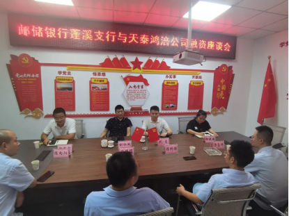 8月23日上午,天泰鸿涪公司与邮储银行蓬溪支行召开融资座谈会,邮储银行蓬溪支行行长任俊儒、副行长谭科谦、鸿涪公司总经理代星、副总经理刘仁政、双方相关人员参加会议。
