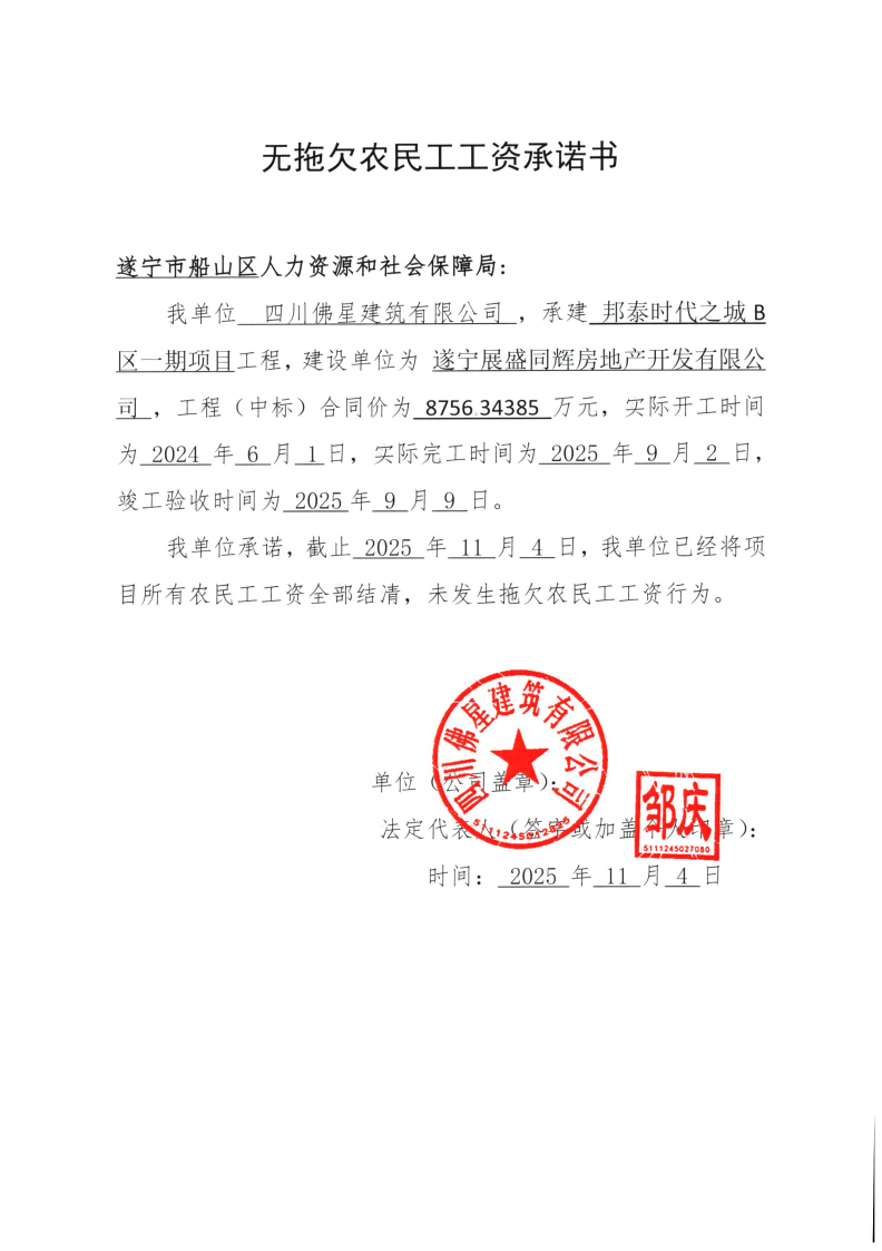 2025年11月14日,遂宁市船山区人力资源和社会保障局收到施工总承包单位四川佛星建筑有限公司提交无拖欠农民工工资承诺书,申请撤销农民工工资专用账户及返还农民工工资保证金保函。根据《工程建设领域农民工工资保证金规定》《遂宁市工程建设领域农民工工资保证金经办规程》相关规定,现对其承建的邦泰时代之城B区一期项目无拖欠农民工工资情况进行公示。公示期满,未发现用人单位有拖欠、克扣农民工工资行为的,我局将按规定程序办理撤销农民工工资专用账户及返还农民工工资保证金保函。
