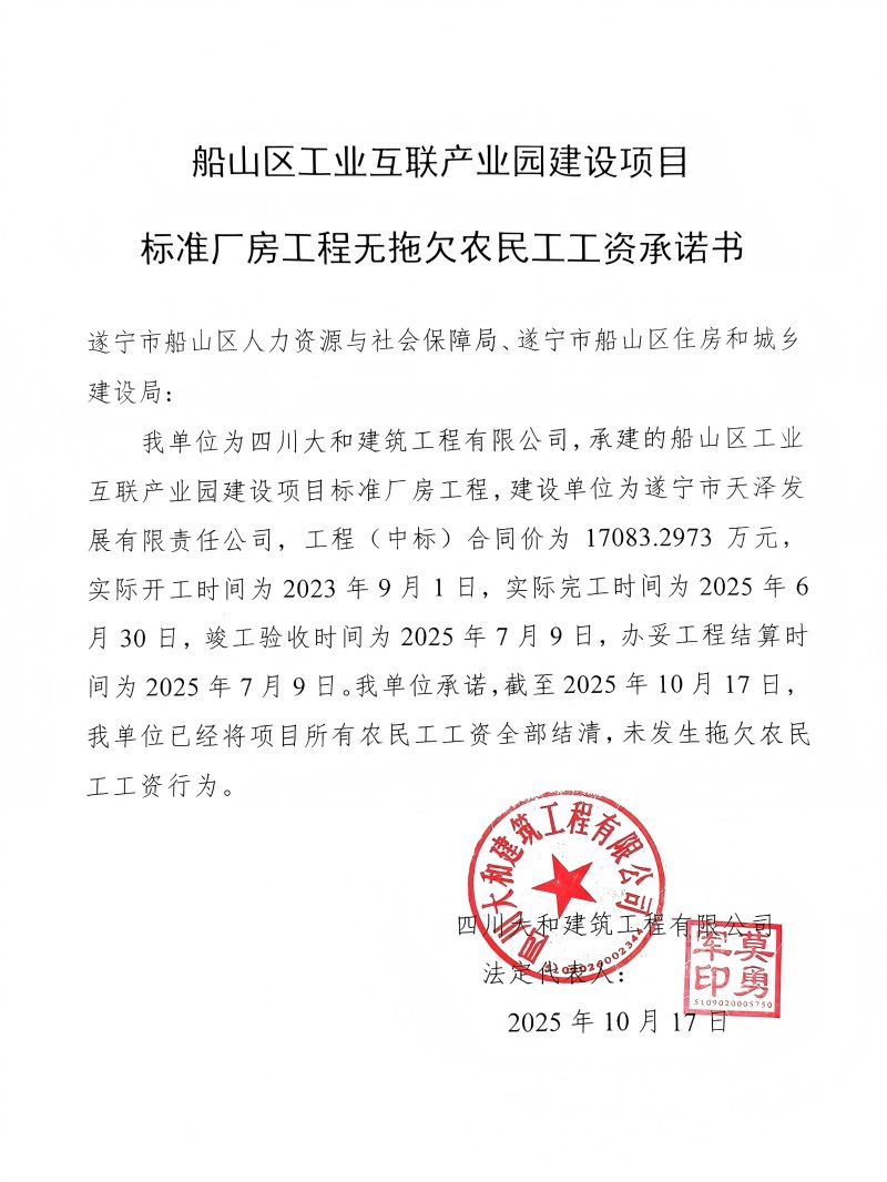 2025年10月20日,遂宁市船山区人力资源和社会保障局收到施工总承包单位四川大和建筑工程有限公司提交的无拖欠农民工工资承诺书,申请撤销农民工工资专用账户及返还农民工工资保证金或银行保函正本。根据《工程建设领域农民工工资保证金规定》《遂宁市工程建设领域农民工工资保证金经办规程》相关规定,现对其承建的船山区工业互联产业园建设项目标准厂房工程无拖欠农民工工资情况进行公示。公示期满,未发现用人单位有拖欠、克扣农民工工资行为的,我局将按规定程序办理撤销农民工工资专用账户及返还农民工工资保证金或银行保函正本。
