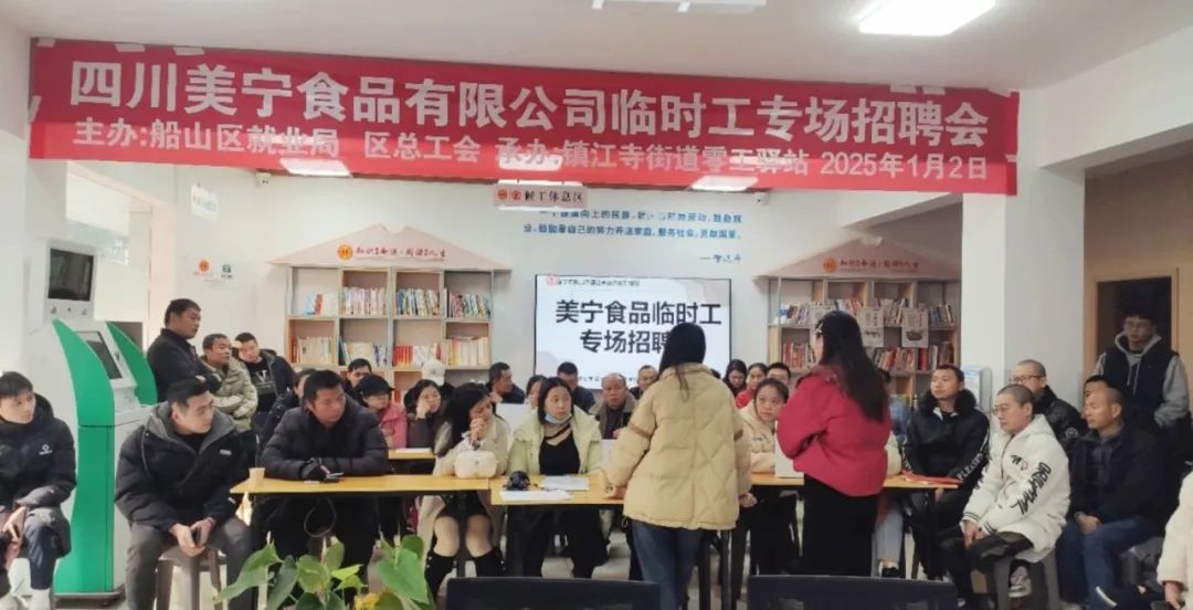 就业是民生之本,稳就业就是稳民生、稳经济、稳发展。在新年的第一个工作日,船山区镇江寺街道零工驿站积极响应就业优先政策,于2025年1月2日14:00如期举行了四川美宁食品有限公司临时工专场招聘会,为辖区居民与美宁企业搭建起一座就业桥梁,为2025年的就业工作奏响了激昂的开篇乐章。