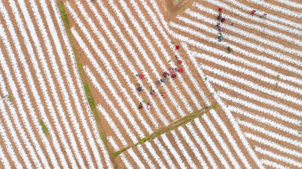 此时的农地里,也是一派忙碌景象。放眼望去,白色的地膜如同浅滩上的层层细浪泛起凌凌波光,数十名工人正各司其职,忙着打窝、下苗、覆土,合力完成玉米苗的栽种工作。
