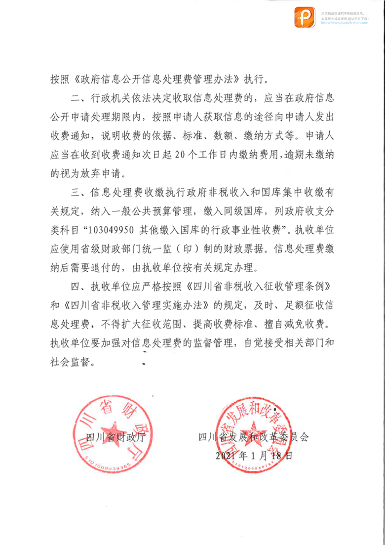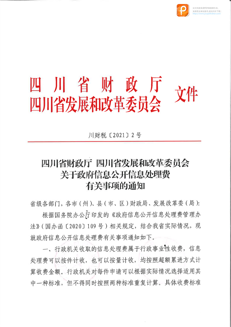 四川省财政厅四川省发展改革委关于政府信息公开信息处理费有关事项的通知(川财税〔2021〕2号)