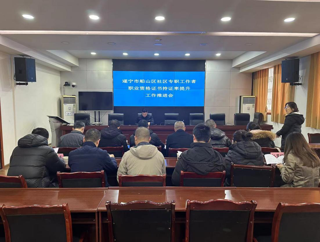 为切实做好我区社区专职工作者专业化职业化管理工作,加快打造一支政治坚定、业务精通、数量充足、结构合理、作风过硬、群众满意的城乡社区专职工作者队伍。根据《中共遂宁市委组织部 遂宁市民政局关于做好社区专职工作者职业资格证书持证率提升工作的通知》(遂船组通〔2024〕13号)文件精神,3月7日,船山区民政局召开社区专职工作者职业资格证书持证率提升工作会。
