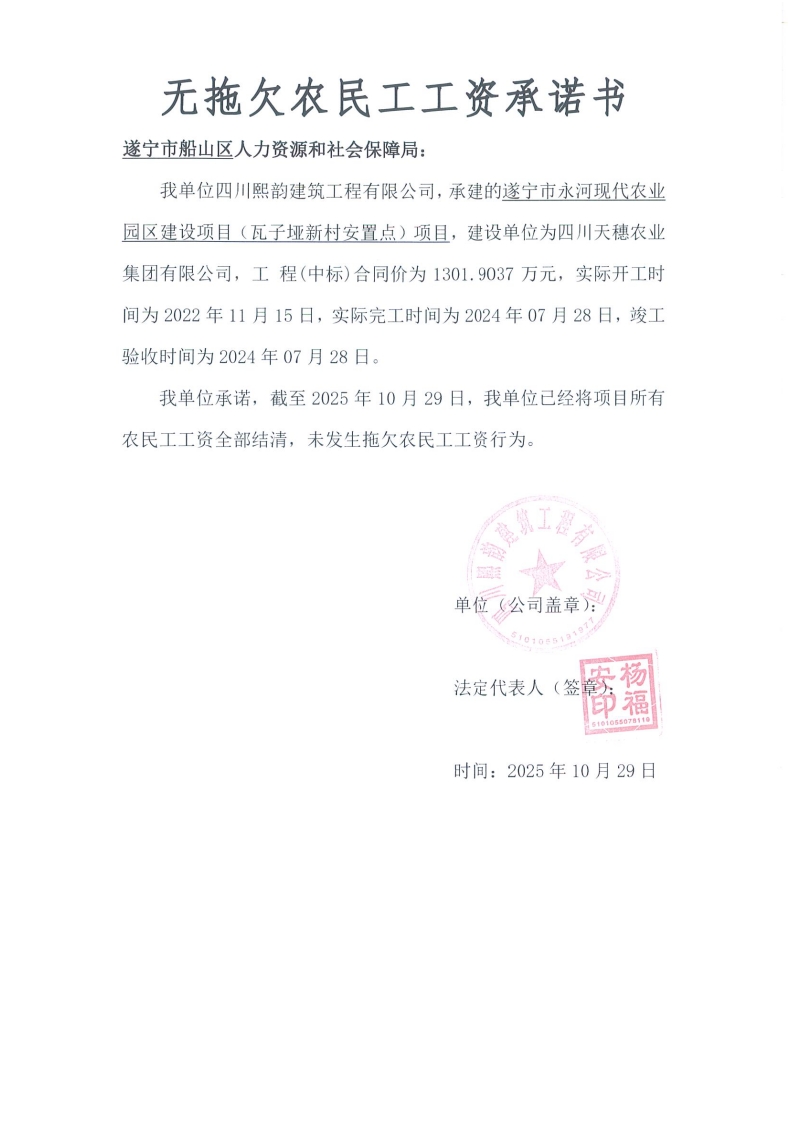 2025年11月19日,遂宁市船山区人力资源和社会保障局收到施工总承包单位四川熙韵建筑工程有限公司提交无拖欠农民工工资承诺书,申请撤销农民工工资专用账户及返还农民工工资保证金保函。根据《工程建设领域农民工工资保证金规定》《遂宁市工程建设领域农民工工资保证金经办规程》相关规定,现对其承建的遂宁市永河现代农业园区建设项目(瓦子垭新村安置点)项目无拖欠农民工工资情况进行公示。公示期满,未发现用人单位有拖欠、克扣农民工工资行为的,我局将按规定程序办理撤销农民工工资专用账户及返还农民工工资保证金保函。