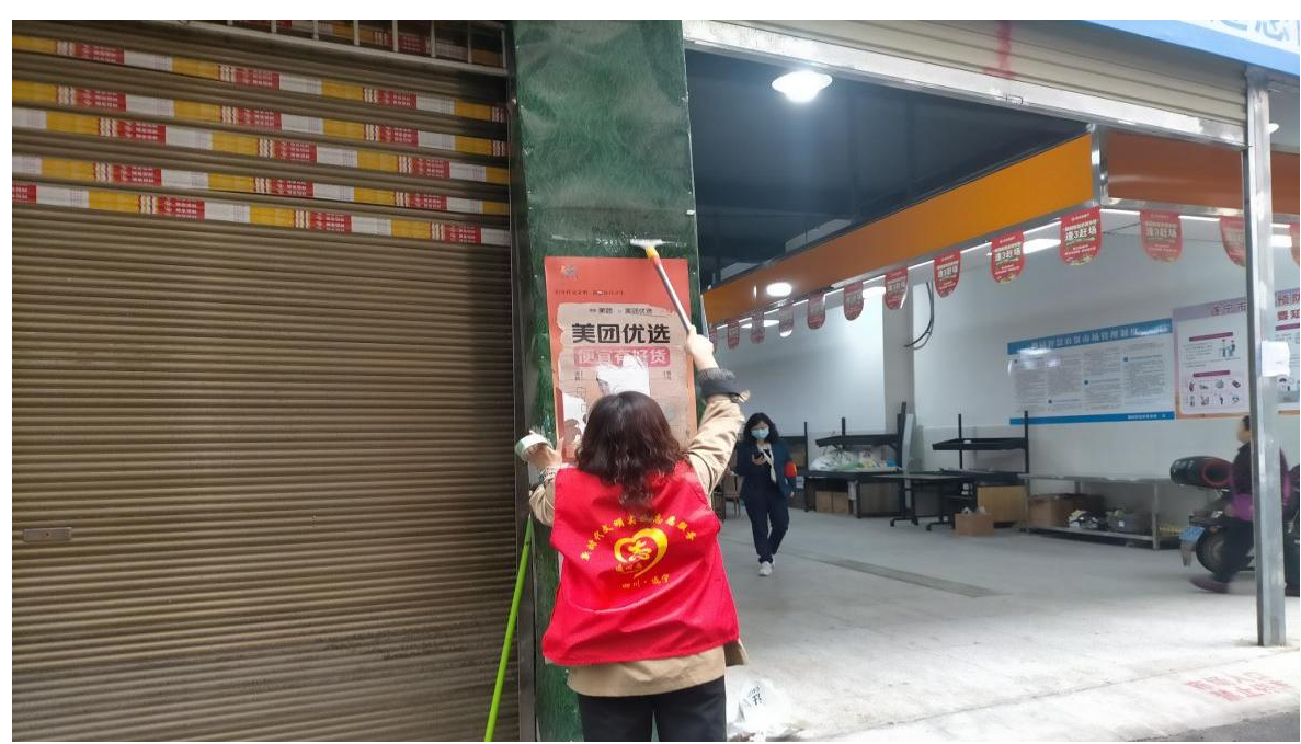 活动中,大家分工明确,一部分志愿者负责用小铲子仔细刮去辖区沿街的“牛皮癣”。另一部分志愿者则拿垃圾钳、垃圾袋对沿街路面进行巡查,对发现的烟头、果皮、纸屑等垃圾用垃圾钳清理。还有一部分志愿者对街面乱停乱放的共享单车进行规范摆放,保持路面整洁规范。同时积极引导临街商铺把物品规范摆放,做好门前“5包”,即一包卫生、二包立面、三包绿化、四包秩序、五包亮化。