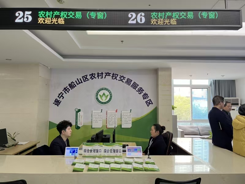 遂宁市主城区农村产权交易服务专窗位于船山区政务服务大厅2楼,由区政务服务和数据中心、区公共资源交易服务中心统筹运营,主要承担农村产权交易信息发布、组织交易、政策咨询等业务。区农村产权交易实行统一平台建设、统一交易规则、统一信息发布、统一服务标准、统一交易鉴证、统一交易监管的“六统一”模式,将农村土地承包经营权、农村集体经营性建设用地入市等10余个“规定动作”品目,全部纳入农村产权交易平台“入场”交易,积极推动农村产权交易标准化、规范化开展,激活农村要素潜能,提升农村产权价值,增加农村集体经济组织和农民的财产性收入。