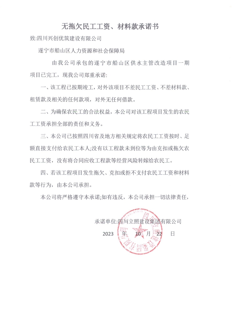2025年11月19日,遂宁市船山区人力资源和社会保障局收到施工总承包单位四川立照建设集团有限公司提交无拖欠农民工工资承诺书,申请撤销农民工工资专用账户及返还农民工工资保证金保函。根据《工程建设领域农民工工资保证金规定》《遂宁市工程建设领域农民工工资保证金经办规程》相关规定,现对其承建的遂宁市船山区供水主管改造项目一期项目无拖欠农民工工资情况进行公示。公示期满,未发现用人单位有拖欠、克扣农民工工资行为的,我局将按规定程序办理撤销农民工工资专用账户及返还农民工工资保证金保函。