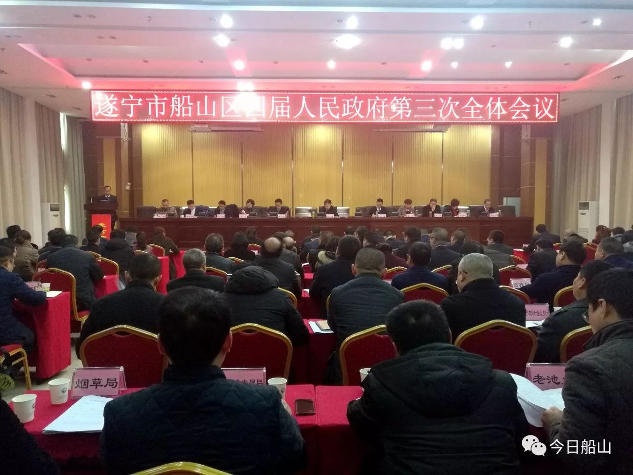 12月29日下午,船山区四届人民政府第三次全体会议举行。会议深入贯彻落实党的十九大、中央经济工作会议、省委经济工作会议以及省委、市委、区委全会精神,全面总结2017年政府工作,科学研判当前形势,安排部署2018年工作,为全区加快发展、弯道超车,决胜全面建成小康社会凝心聚力,推动全区各项工作再上新台阶。区委副书记、区长韩麟主持会议并讲话。区委常委、常务副区长陆京会,区委常委、副区长孙炜,副区长周毅、郑良、毛金花、李江源参加会议。物流港党工委书记、管委会主任牛斌,区人大常委会副主任洪琼,区政协副主席袁学文,区人武部部长陈懿应邀参加会议。