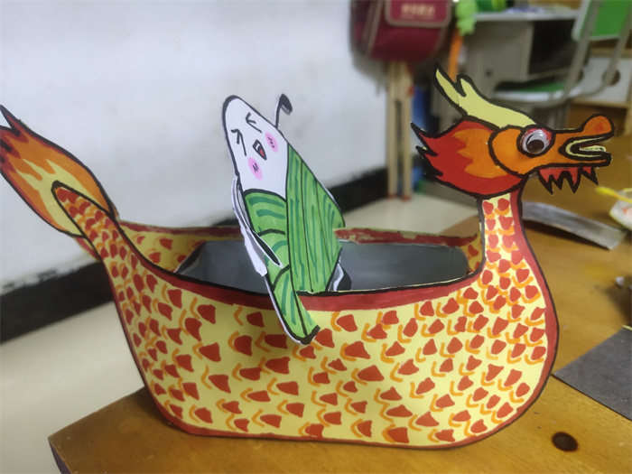 在家长的指导下,孩子们纷纷包起了各式各样漂亮的粽子。他们还纷纷开动脑筋,发挥丰富想象,创意性地进行粽子和龙舟手工作品制作。一双双灵巧的小手,把一个个粽子、一艘艘“龙舟”装饰得活泼可爱又极富童趣。
