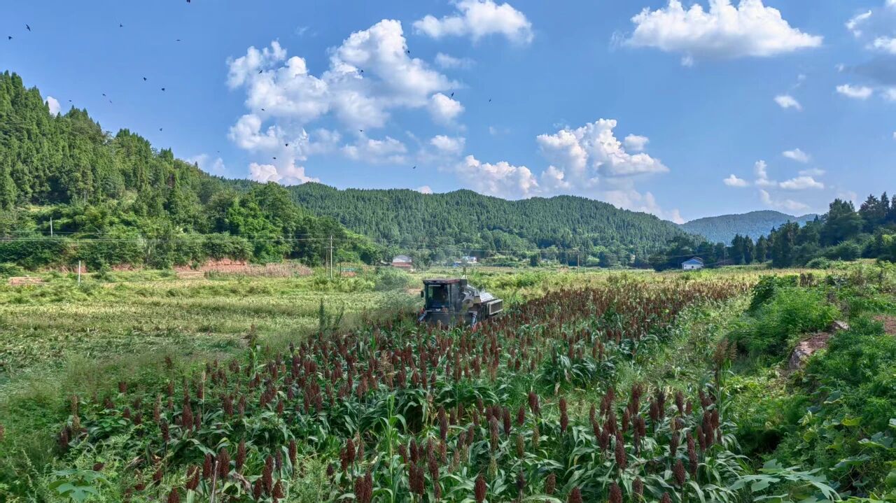 9月15日,在河沙镇谷村的遂宁市金粮源智慧农业科技有限公司河沙种植基地,连片的高粱地里,一簇簇火红的高粱穗缀满饱满颗粒,收割机正轰鸣着穿梭其间,摘穗、脱粒、秸秆粉碎一气呵成。