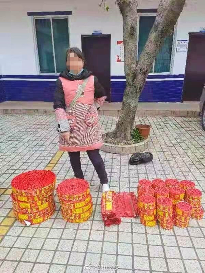 2月1日(大年初一),遂宁市公安局船山区分局凯旋路派出所民警在巡逻中发现,遂宁市城区南小区绿荫街某单元一楼楼梯间放有大量鞭炮。随后民警展开调查,成功挡获了鞭炮所有者谭某(经开区人,女,55岁,香蜡钱纸零售摊主),共查获6盒一万响、5盒五千响、43盒两千响、41盒一百响鞭炮,民警随后将其带回派出所进行了询问,谭某对非法储存、销售烟花爆竹的违法事实供认不讳。目前,该案件正在办理中。