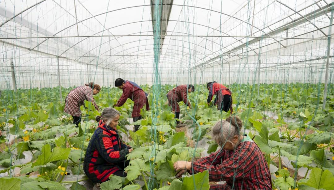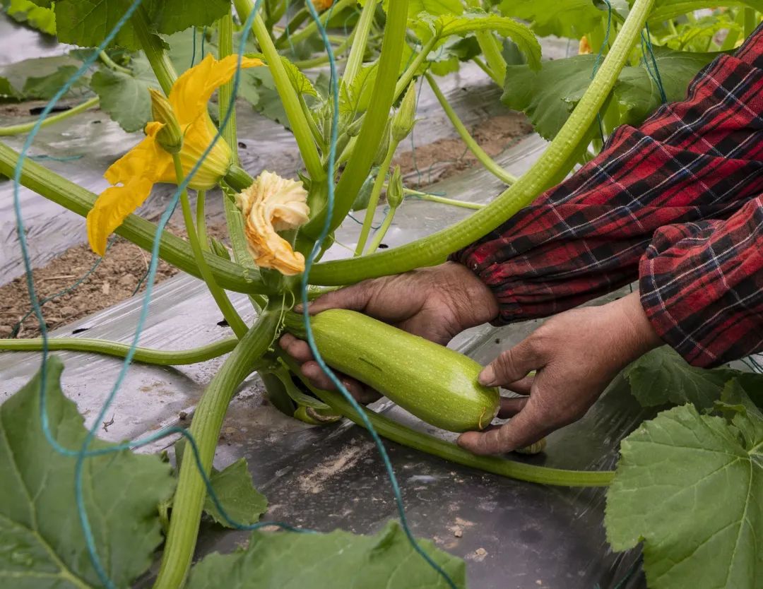 12月14日,记者走进蔬菜大棚,眼前一片绿油油的景象。大片的绿叶底下结着一根根饱满、碧绿的西葫芦,农户在菜地中来往穿梭,进行日常管护和采摘。