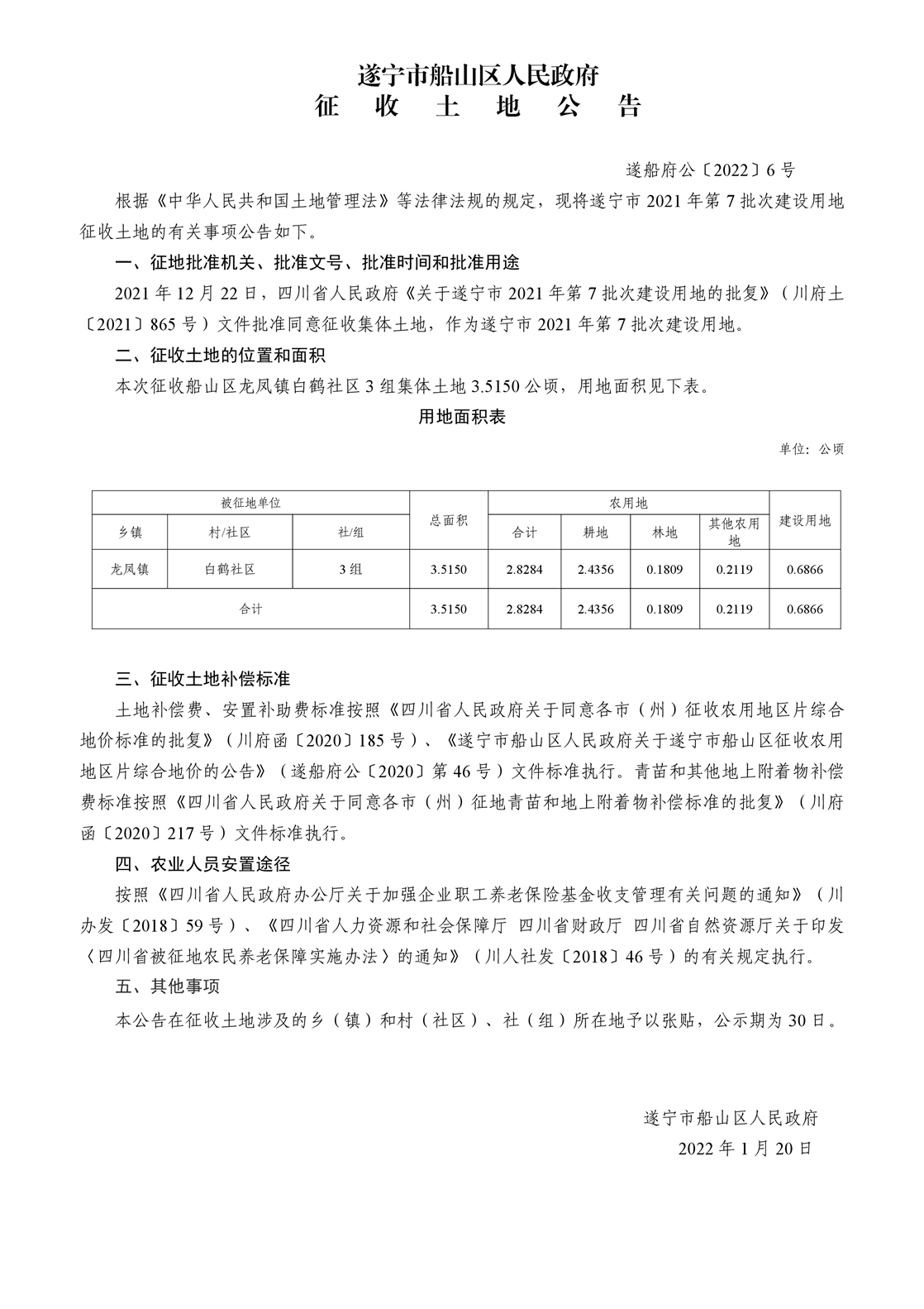 遂宁市船山区人民政府征收土地公告(遂船府公〔2022〕6 号)