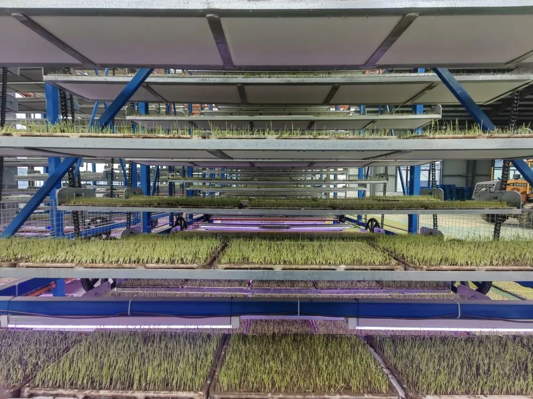 现场工作人员介绍,由于厂房光照存在不足,育秧机内还配备了光照设备,确保每一盘秧苗都能得到充足的“水、肥、光”。这种自动升降循环的设计,还能促进秧苗之间的空气流通,有利于其生长。每完成一次循环往复仅需一个小时左右,相较于传统的人工育秧,大大降低了人工成本和时间成本。通过这种水肥一体化循环的方式,不仅大幅提高了育秧工作效率,而且秧苗的成活率和出苗率也得到了显著提升。