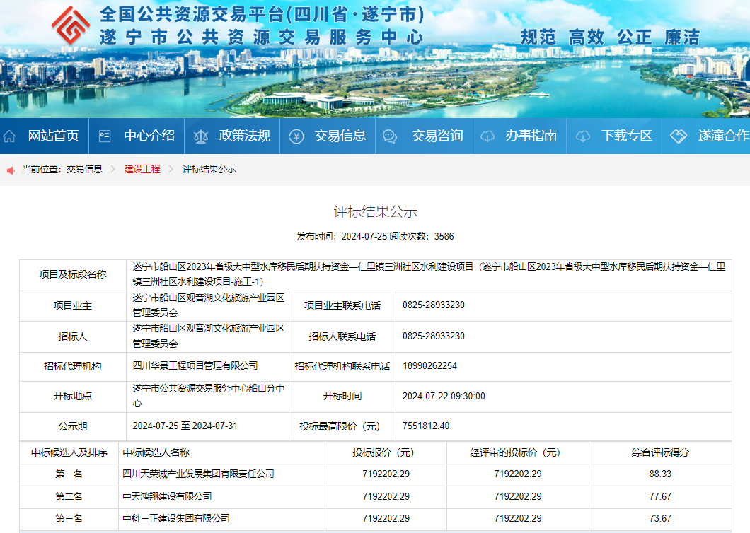 7月25日,观音湖文旅产业园区管理委员会作为业主实施的遂宁市船山区2023年省级大中型水库移民后期扶持资金—仁里镇三洲社区水利建设项目已完成施工招标,正在进行评标结果公示。