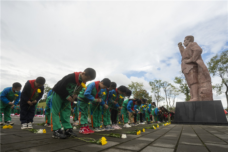 活动最后,全体老师、少先队员、家长代表站在旷继勋烈士纪念碑前,举行了默哀与献花仪式。