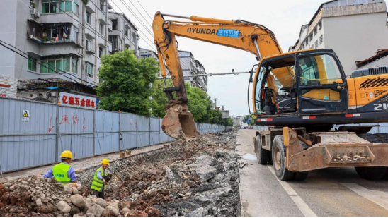 图为开善路道路及管网改造项目。累计完成投资2200万元,投资完成率67%;完成开善东路至南转盘的雨污管网建设及路面恢复,正在实施开善东路至开善河段管网建设。