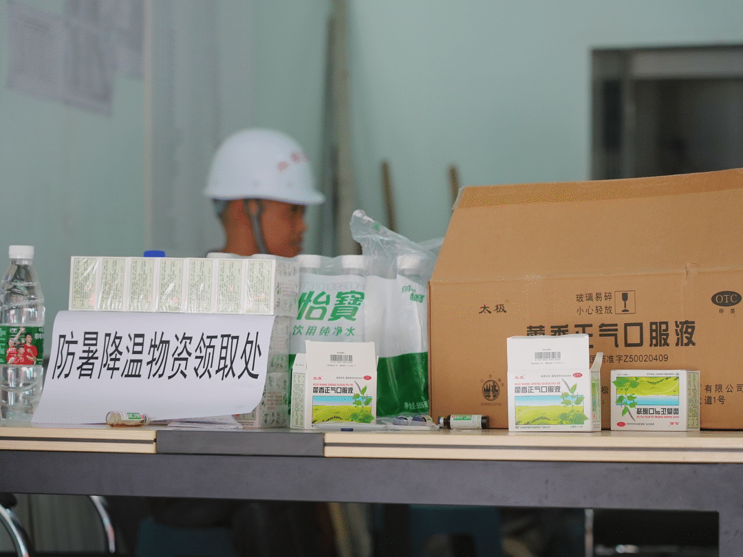 “各位师傅,这里是防暑物资领取处,大家有需要的都免费来领取,高温天气,身体第一!”现场负责人为辛勤工作的一线人员送上防暑的药品,同时叮嘱建设者们注意防暑,安全施工。