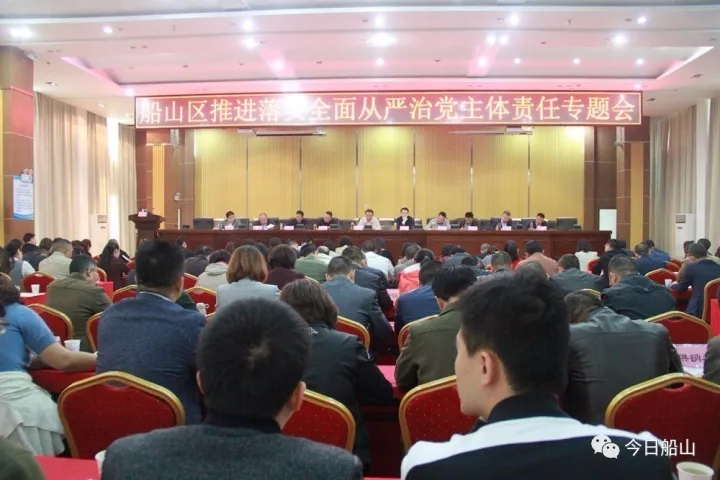 10月10日上午,船山区召开推进落实全面从严治党主体责任专题会。区委书记曹斌出席并讲话。区委副书记、区长韩麟,区委副书记白争春、张凯钇,物流港党工委书记、管委会主任牛斌,区委常委陆京会、程康、蹇世誉、黄钰出席会议。区委常委、纪委书记蒋中治主持会议。