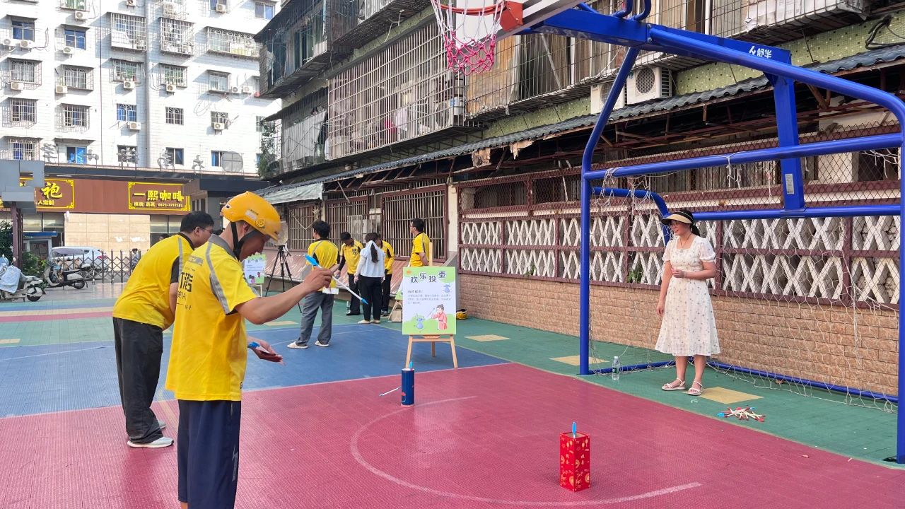 随后骑手们自由参与各项游戏,根据规则收集印章,兑换奖品。游戏共含八个项目:弹球、定点投篮、袋鼠接力赛、盲人击鼓、两人三足跑、筷子夹球、摸石头过河和欢乐投壶。在盲人击鼓中,骑手蒙眼转圈后尝试击中5米外的鼓;摸石头过河需要参赛人员站在砖上,交替移动过河砖前进;袋鼠接力赛要求骑手跳进布袋完成往返跳跃……每项游戏均有专人负责组织,现场气氛热烈。