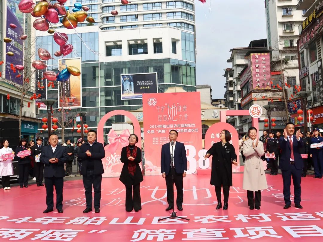 在第114个“三八”国际妇女节来临之际,3月6日下午,2024年船山区农村适龄妇女免费“两癌”筛查项目启动仪式在中心商业区百福广场举行。市妇联党组成员、副主席杨梅,巿卫健委党组成员、副主任刘力铖,船山区委常委、宣传部部长、区总工会主席白怀湘,船山区妇联党组书记、主席邓敏,船山区卫健局党委书记、局长徐栋良,船山区妇幼保健院党委书记宋光辉,船山区妇幼保健院院长喻永兵出席仪式。