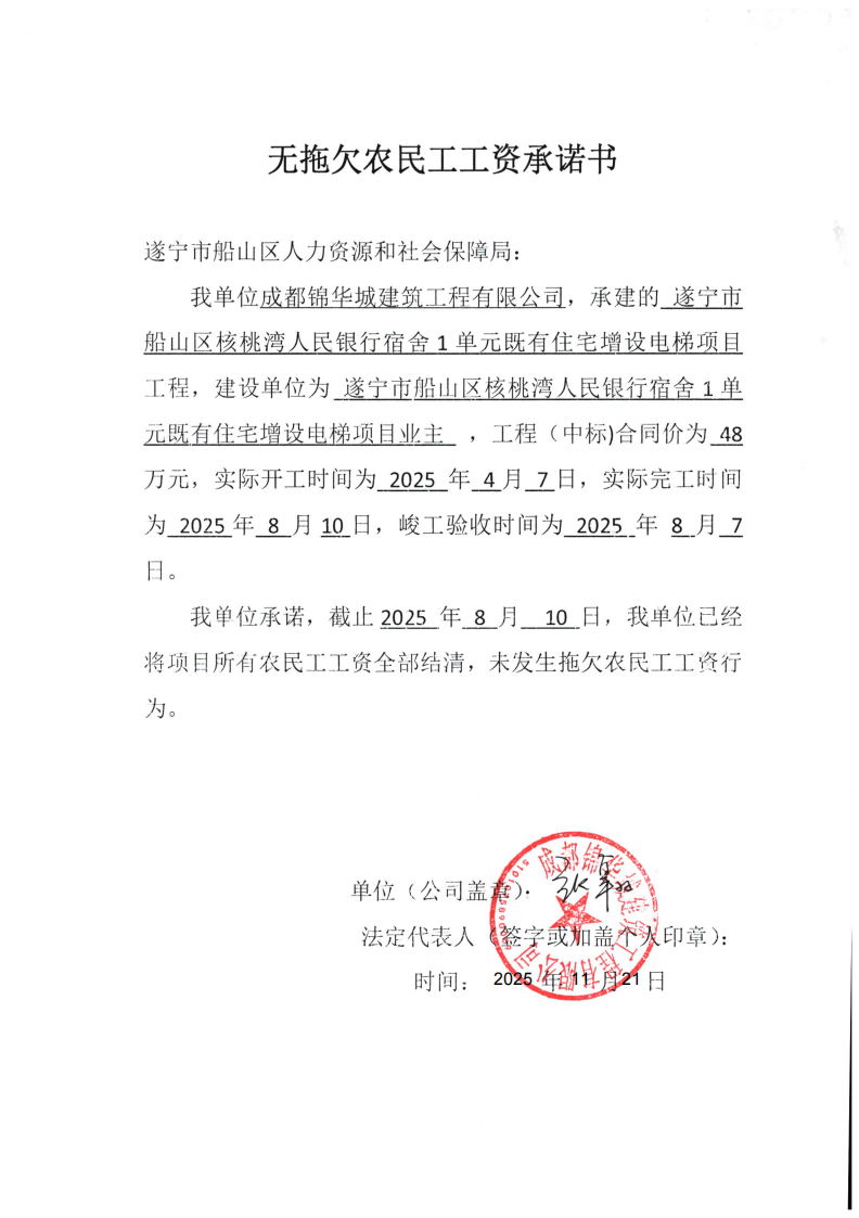 2025年11月24日,遂宁市船山区人力资源和社会保障局收到施工总承包单位成都锦华城建筑工程有限公司提交无拖欠农民工工资承诺书,申请撤销农民工工资专用账户及返还农民工工资保证金保函。根据《工程建设领域农民工工资保证金规定》《遂宁市工程建设领域农民工工资保证金经办规程》相关规定,现对其承建的遂宁市船山区核桃湾人民银行宿舍1单元既有住宅增设电梯项目无拖欠农民工工资情况进行公示。公示期满,未发现用人单位有拖欠、克扣农民工工资行为的,我局将按规定程序办理撤销农民工工资专用账户及返还农民工工资保证金保函。