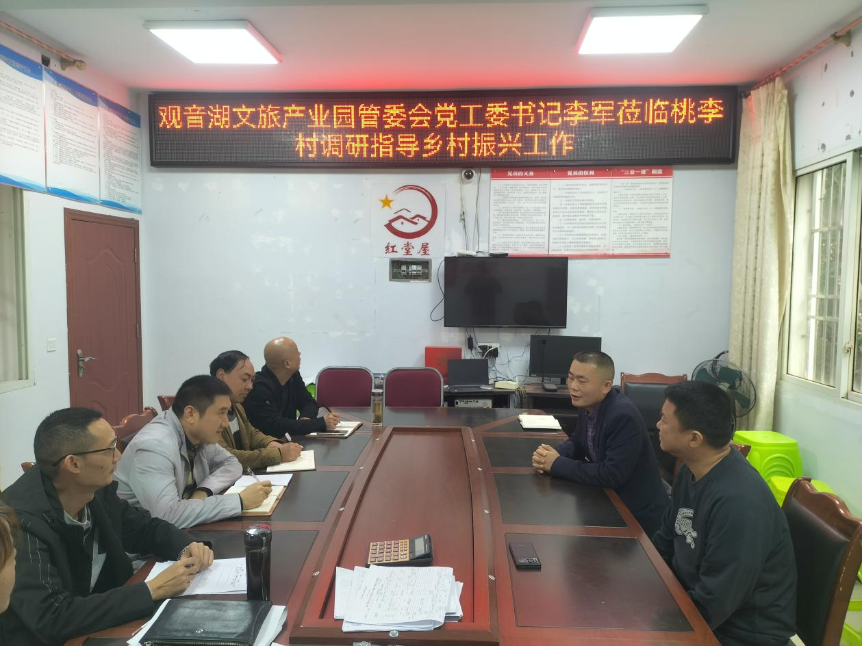 2023年11月3日,观音湖文旅产业园区党工委书记李军带队,党工委副书记、纪工委书记陈雷及相关工作人员随行,到仁里镇桃李村调研指导乡村振兴工作,了解派出驻村第一书记漆永生开展驻村工作有关情况。村支部书记姚虎向李军、陈雷等汇报了桃李村村情民情、产业发展、集体经济发展等方面情况,以及当前存在的主要困难。李军表示,下一步将积极整合资源,搭建平台找发展路子,与桃李村共同进退,同时督促漆永生积极发挥驻村第一书记作用,多观察学习、多思考谋划,要经常向园区反馈桃李村发展情况和存在问题,主动提出工作建议或举措,搭建起园区和镇村之间良好沟通的桥梁,以实际行动推进桃李村乡村振兴工作再上新台阶。