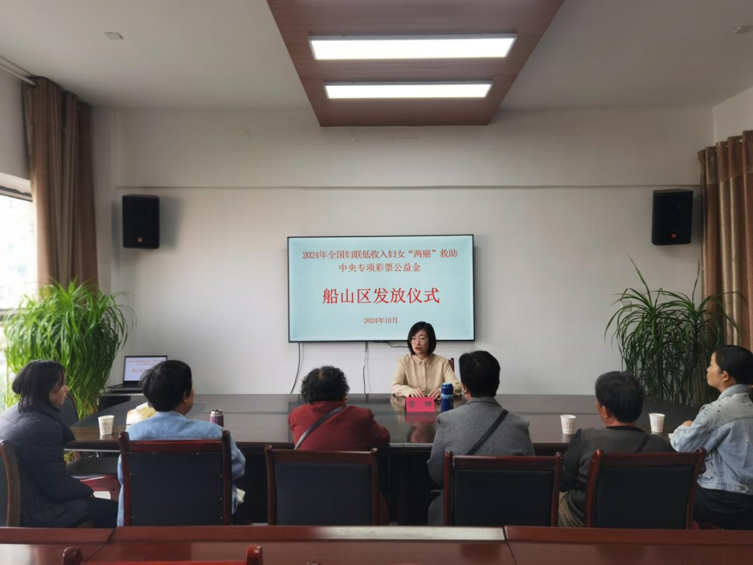 为深入贯彻落实党和政府对城乡困难妇女的关怀,切实帮助“两癌”患病妇女解决实际困难,10月16日,船山区妇联举行2024年度全国妇联低收入妇女“两癌”救助资金(中央专项彩票公益金)发放仪式,为船山区8名符合救助条件的“两癌”患病妇女每人发放救助金1万元,共计8万元,为她们送去了党和政府的关怀以及妇联“娘家人”的关爱。