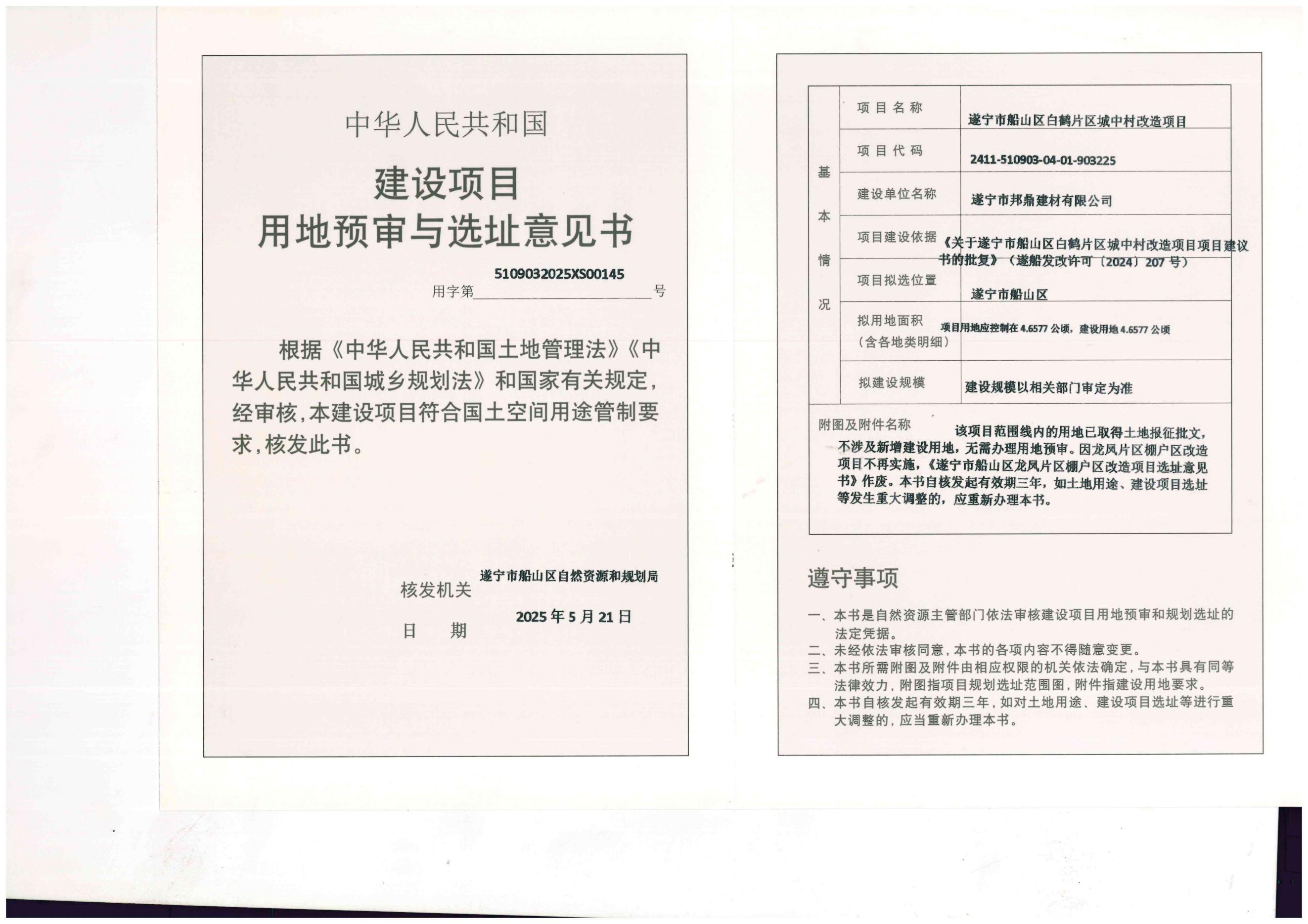 遂宁市船山区白鹤片区城中村改造项目建设项目用地预审与选址意见书