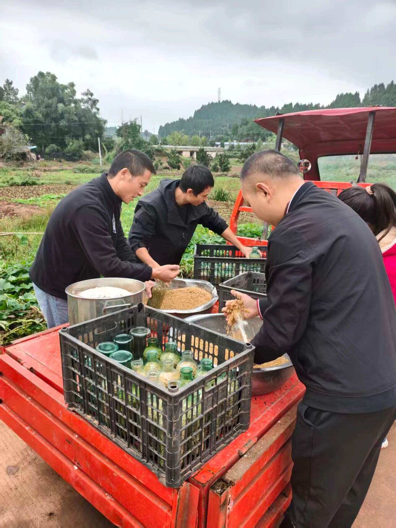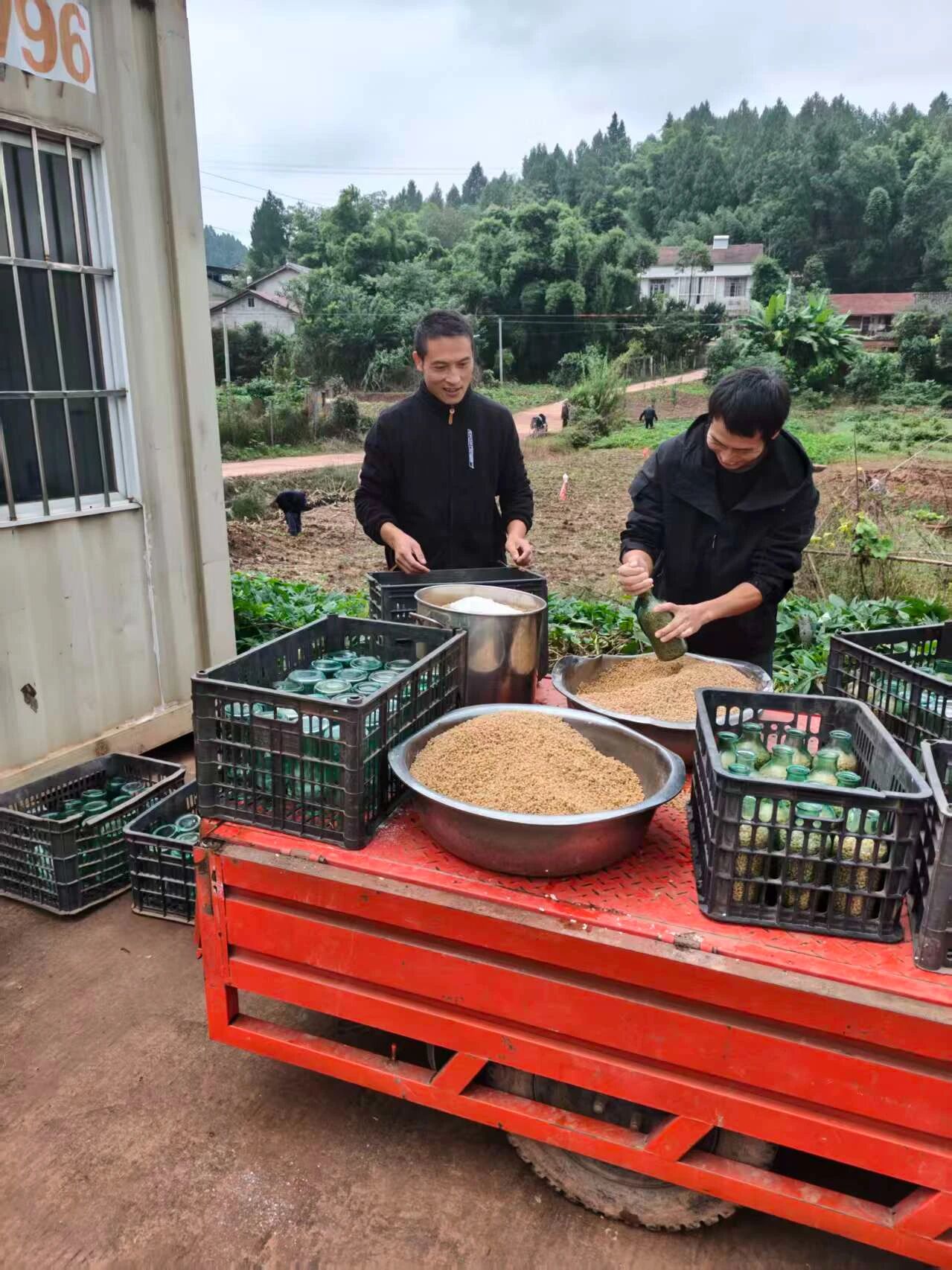 菌菇种植基地工作人员罐装制种基料