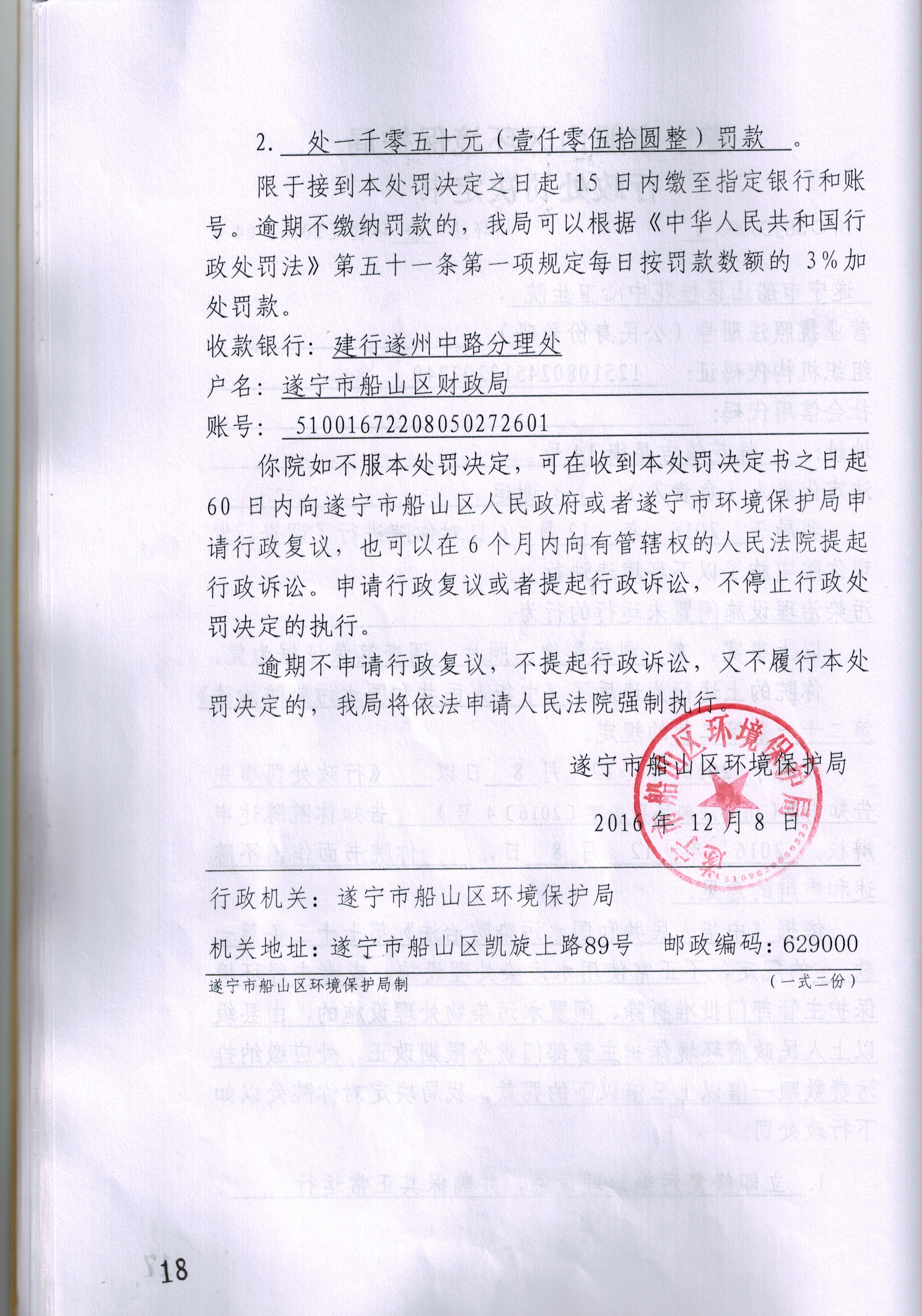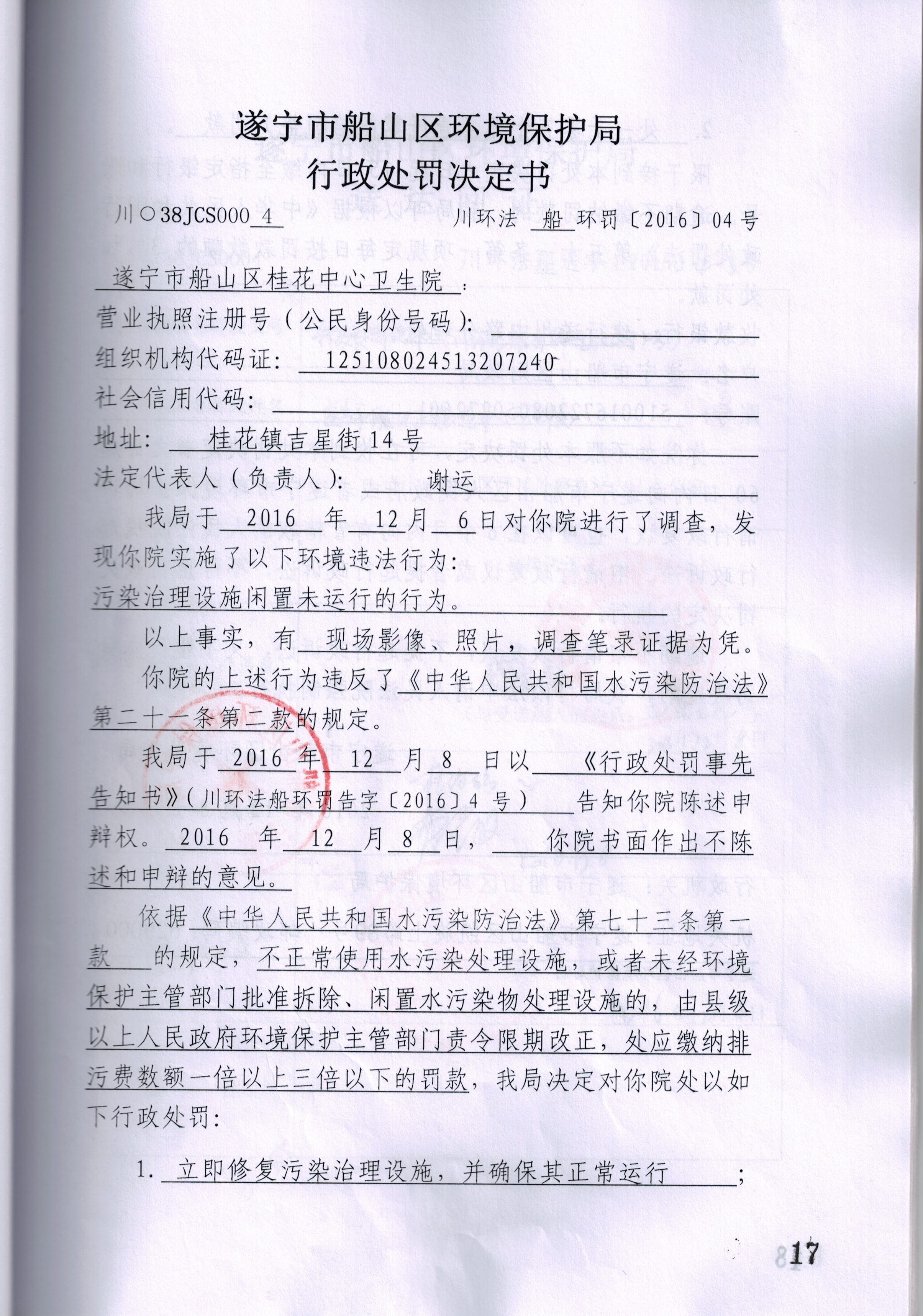 遂宁市船山区桂花镇中心卫生院行政处罚决定书