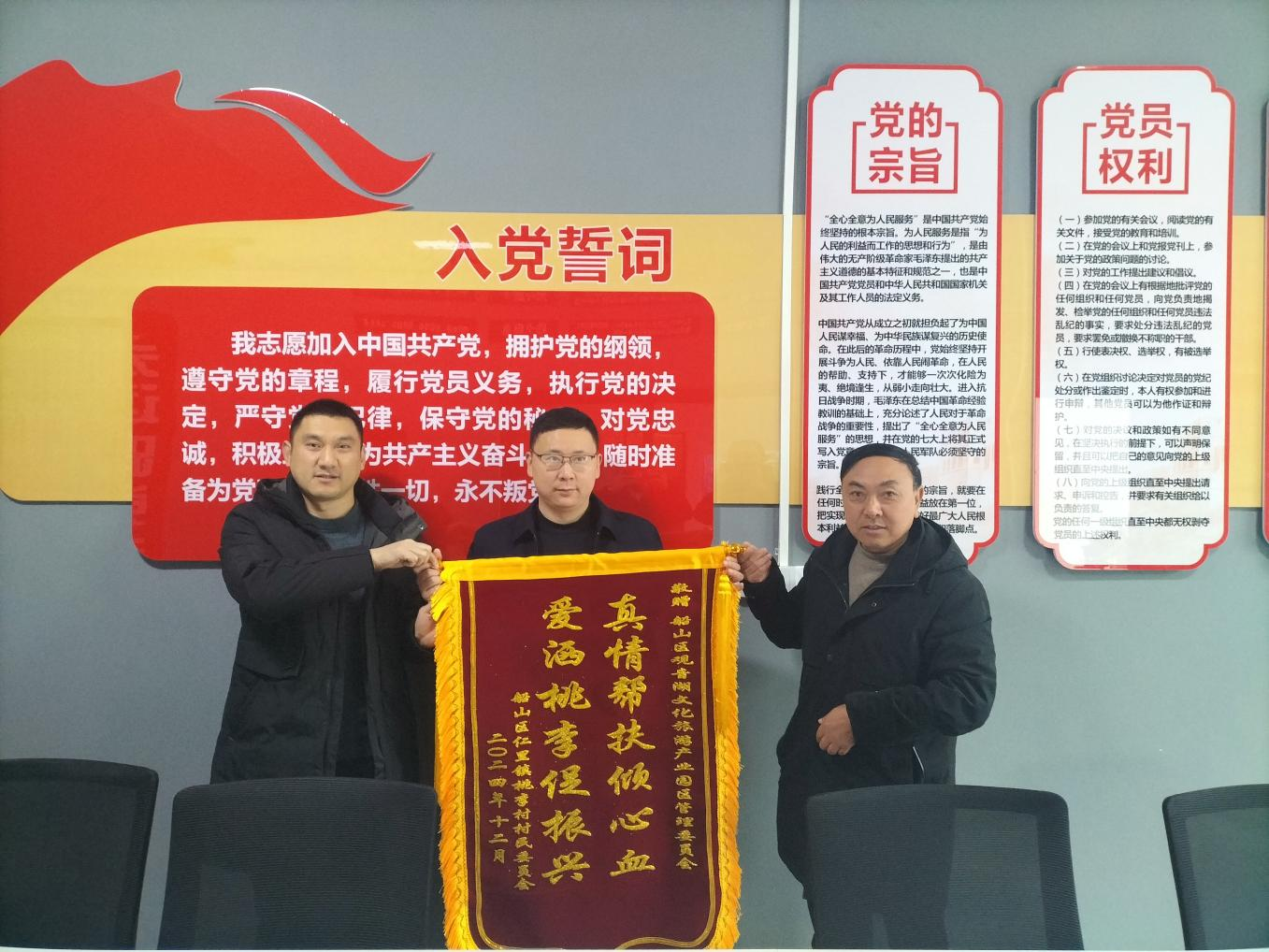近日,船山区仁里镇桃李村党总支书记、村委会主任姚虎和驻村工作队第一书记漆永生一起,将一面绣有“真情帮扶倾心血 爱洒桃李促振兴”的锦旗送到观音湖文化旅游产业园区党工委副书记、纪工委书记陈兵手中,以感谢观音湖文化旅游产业园区管委会对驻村帮扶工作给予的大力支持。