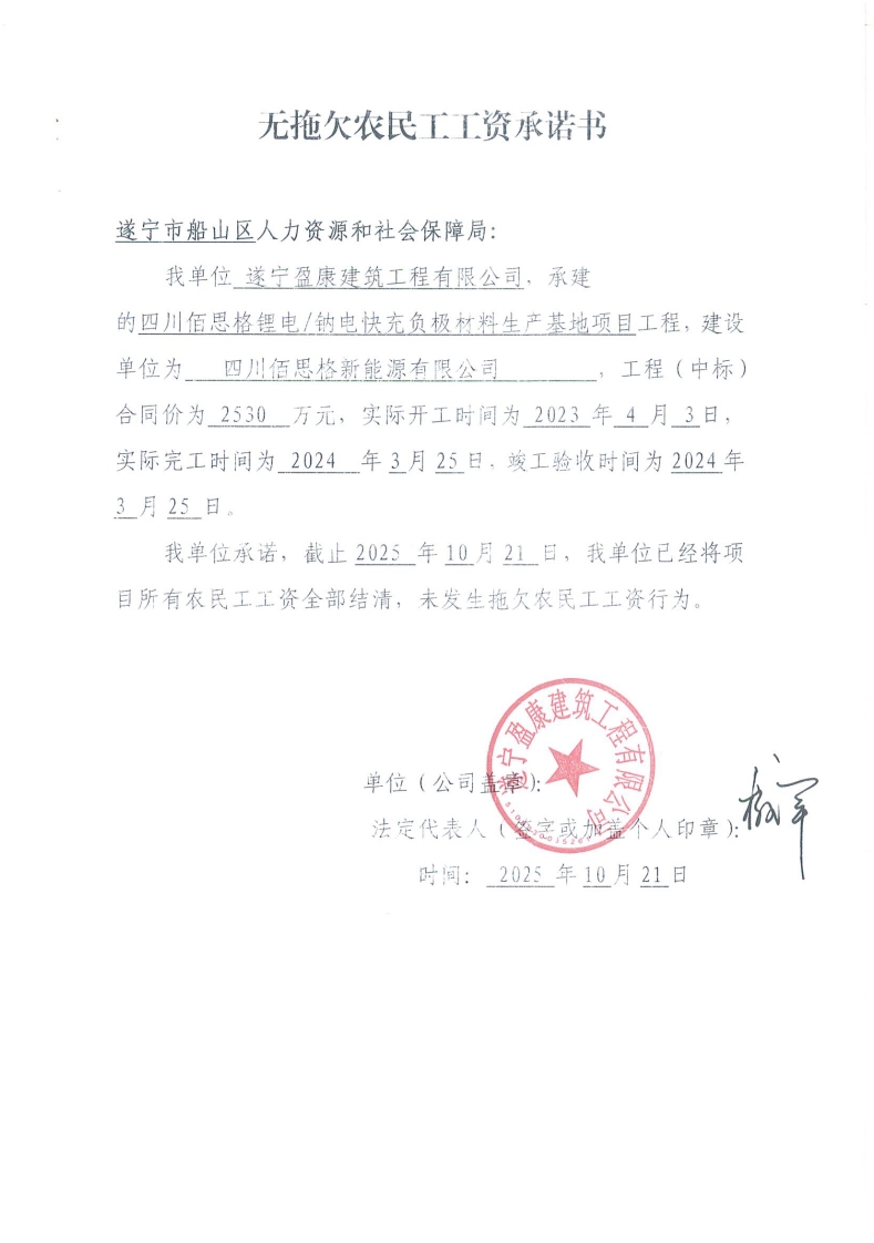 2025年11月19日,遂宁市船山区人力资源和社会保障局收到施工总承包单位遂宁盈康建筑工程有限公司提交无拖欠农民工工资承诺书,申请撤销农民工工资专用账户及返还农民工工资保证金保函。根据《工程建设领域农民工工资保证金规定》《遂宁市工程建设领域农民工工资保证金经办规程》相关规定,现对其承建的四川佰思格锂电/钠电快充负极材料生产基地项目工程项目无拖欠农民工工资情况进行公示。公示期满,未发现用人单位有拖欠、克扣农民工工资行为的,我局将按规定程序办理撤销农民工工资专用账户及返还农民工工资保证金保函。