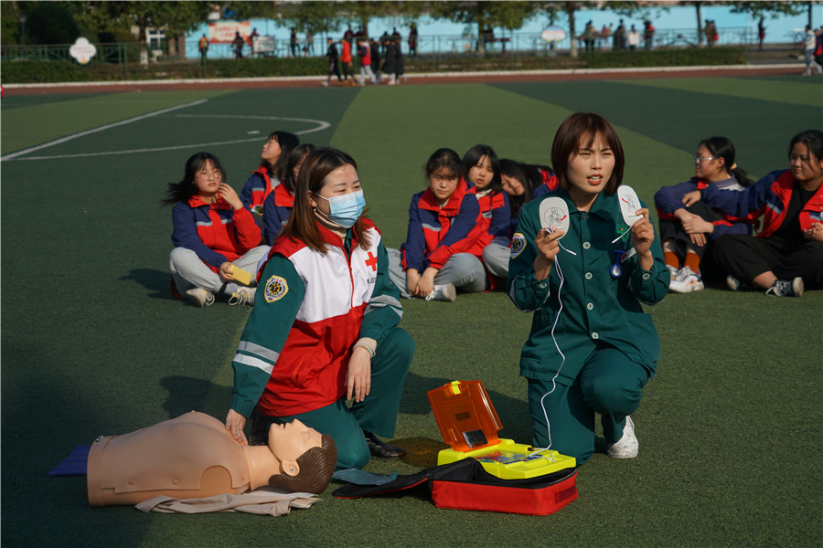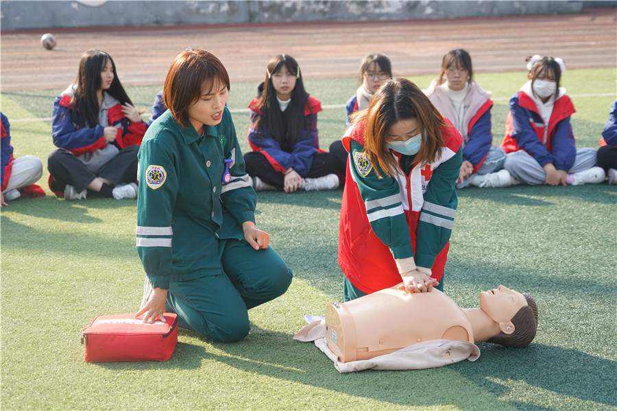 培训中,医护人员用浅显易懂的语言与现场演示相结合,讲解了心肺复苏操作、气道梗阻后常用的海姆立克法急救等知识。并针对学校和日常生活中可能遇到的突发状况,如何进行科学自救及施救进行了现场讲解和生动演示,尤其强调了“黄金四分钟”的重要性。