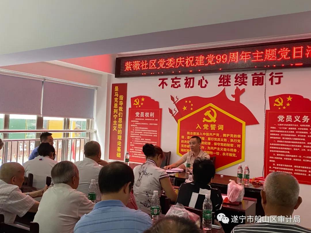 近日,在党的第99个生日即将来临之际,船山区审计局党支部与联系的紫薇社区共同开展"不忘初心、继续前行"主题党日活动。本次活动通过表彰社区优秀党员、重温入党誓词、讲专题党课的形式,让党员群众接受党内组织生活教育和洗礼,纪念党的生日。