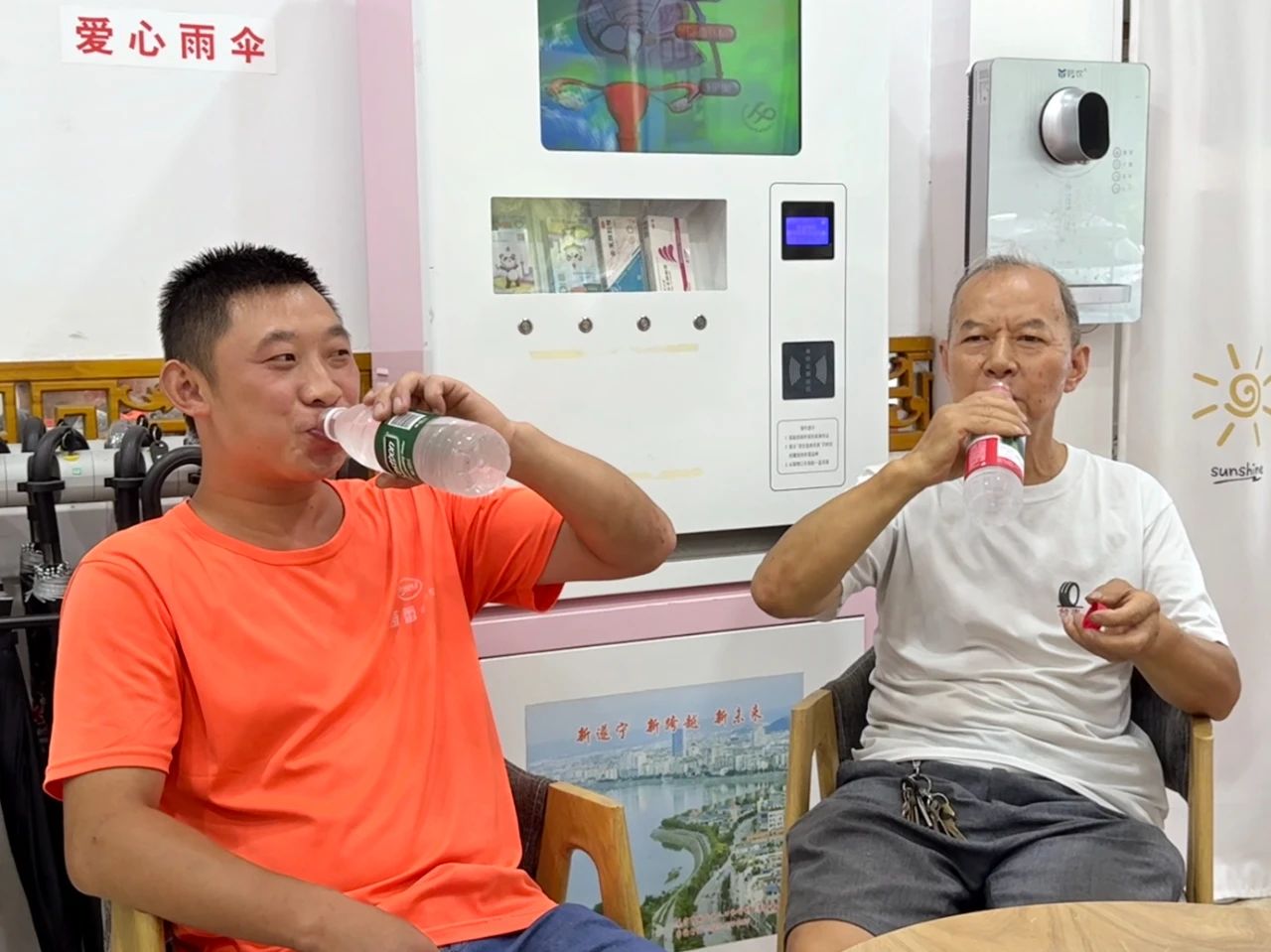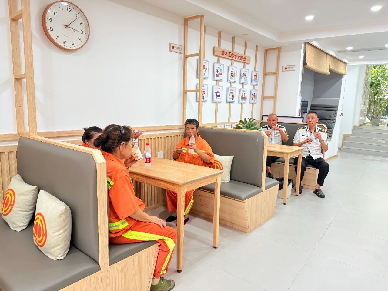 滨河社区与犀牛社区新时代文明实践站内,两台设备等候着户外劳动者们的到来。冰柜内存有瓶装矿泉水,社区志愿者定时检查补货,确保冰柜始终“满仓”,并张贴“免费提供”标识,方便劳动者按需自取;饮水机供应恒温热水,并备有一次性纸杯,方便劳动者随时取用。除饮品供应外,站内空调恒温,配备舒适桌椅、无线网络及微波炉,劳动者可在此热饭、充电、短暂休憩。这里早已不是简单的“歇脚处”,而是劳动者们心中的“舒适港湾”。空调的凉风扑面而来,饮水的甘甜流淌而下,拂去了劳动者奔波的疲惫与暑气的燥热。