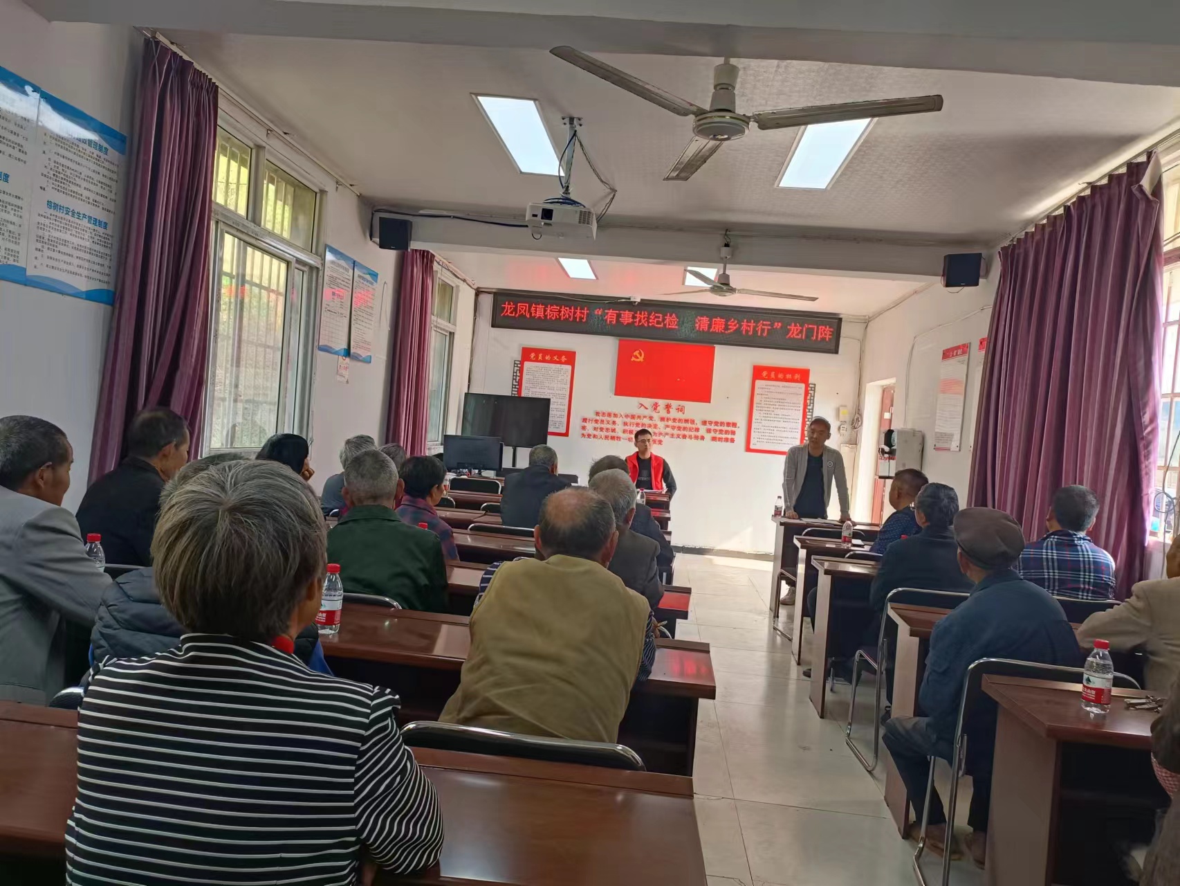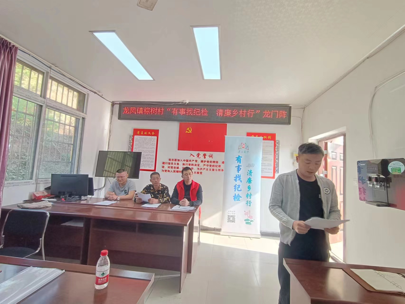 2024年3月27日上午,在村委会会议室,棕树村召开“有事找纪检,清廉乡村行”龙门阵现场会。到会的有船山区纪委干部陈宝全,龙凤镇纪委干部舒凡,棕树村村两委干部、党员代表、村民代表,会议由监督委员会主任夏祖斌主持。议程如下。