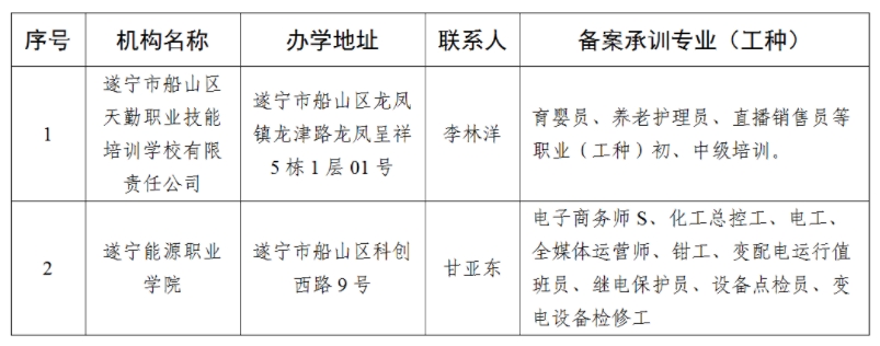 为促进我区就业创业培训质效稳步提升,进一步提高参训劳动力就业创业能力和就业创业成功率,根据《遂宁市人力资源和社会保障局 遂宁市财政局关于转发〈四川省就业创业培训管理办法〉的通知》(遂人社办发〔2020〕49号)精神,本着“公平规范、自愿申报、联合审查”的原则,经自愿申报、资料审查、实地核实,拟新增2家培训机构作为我区2024年就业创业培训承训机构,现将相关信息予以公示: