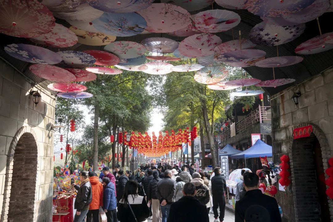 和煦暖阳相伴八天超长假期,群众出游兴致持续高涨。大年初一,龙凤古镇景区人头攒动,一条长10多米的“金龙”在景区腾空而起,不断展现出盘、滚、游、翻等高难度动作。伴随着一路锣鼓声,市民游客紧紧跟随“金龙”前行,在传统表演中感受过年氛围。