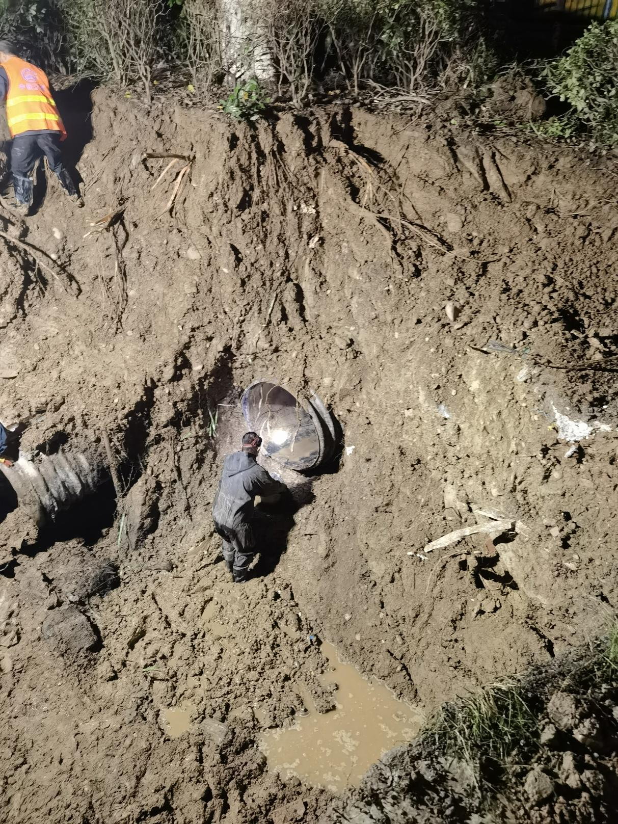 1小时内完成现场临时断道与安全围挡,设置警示标识,严禁车辆行人靠近危险区域;2小时内集结抢险人员、挖掘机等专业设备,搭建临时指挥点,明确分工推进作业;4小时内精准定位病害核心——检查井漏水点及下方泥土空洞区,为抢险方案制定提供关键依据;12小时内完成第一阶段抢险,通过填充加固空洞、修复检查井漏水部位,成功恢复经开区污水泵站正常抽排功能,阻断险情扩大。
