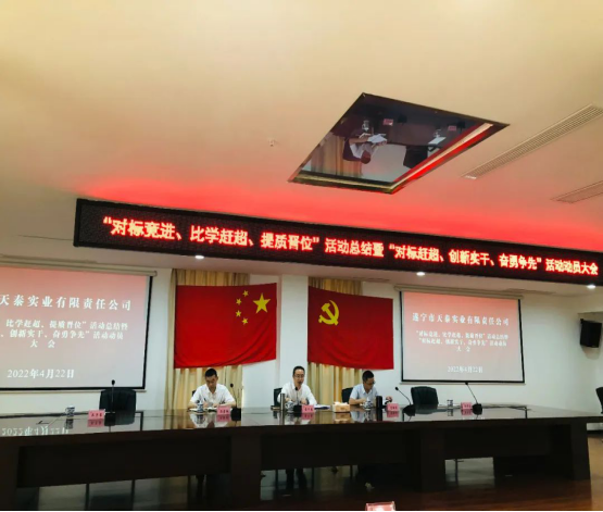 4月22日,天泰实业公司召开“对标竞进、比学赶超、提质晋位”活动总结暨“对标赶超、创新实干、奋勇争先”大会。党支部书记、董事长蒲千春主持会议并讲话,全体高管、职工参加会议。