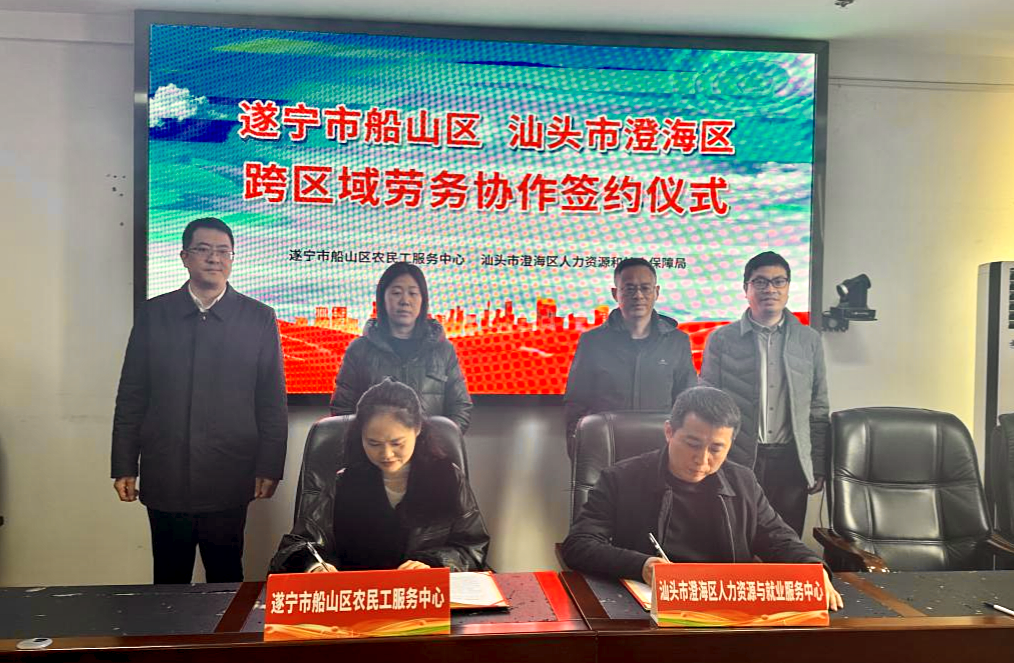 会上,遂宁市船山区农民工服务中心与汕头市澄海区人力资源与就业服务中心签订了跨区域劳务合作协议,双方将在劳务协作共建信息平台、劳动力有序流动、权益保障协作等方面开展合作。双方参会代表分别介绍了遂宁市和汕头市基本情况,围绕各自经济发展、劳动力资源优化配置、灵活的跨区域劳务协作机制等方面内容进行深入讨论。
