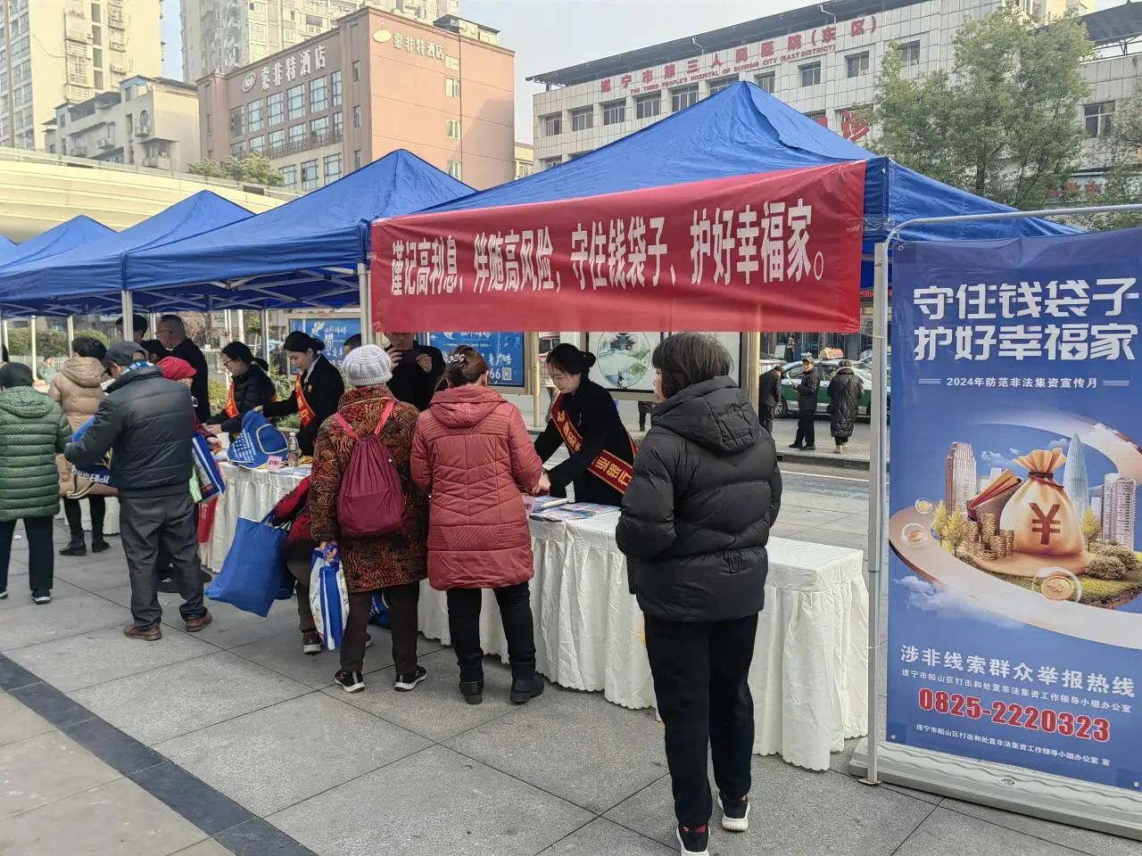 为提高公众对非法集资风险的识别和防范能力,保护人民群众财产安全,12月16日,船山区按照省、市关于防范非法集资集中宣传工作要求,在船山区裕丰园广场积极开展以“守住钱袋子·护好幸福家”为主题的防范非法集资集中宣传日活动。