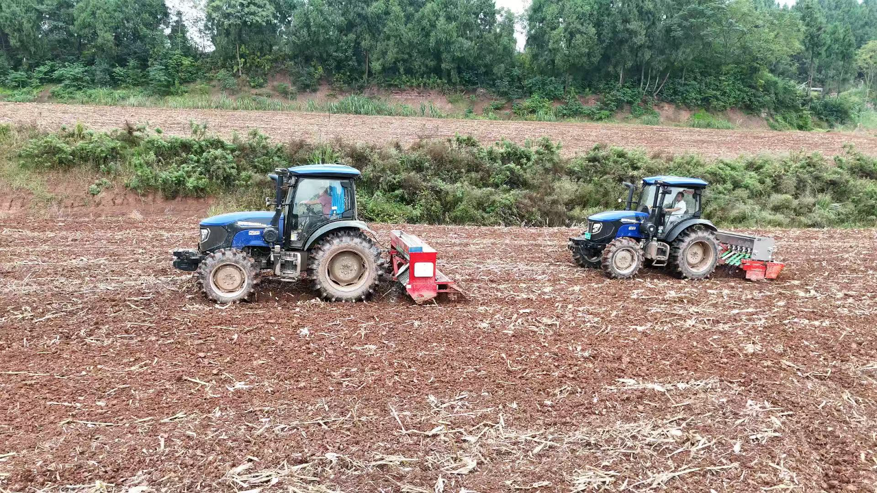 11月5日,在船山区桂花镇杉树村,田野间一派繁忙景象。1200亩冬小麦抢播作业正有序开展,两台经过改装的旋耕机在田间来回穿梭,轰鸣声中,旋耕、施肥、播种、覆土等多道工序一次性完成,一粒粒饱满的小麦种子与肥料精准落入土壤,为后续生长埋下希望的种子。