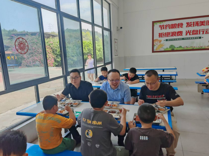 在实地考察后,领导们与学生们一起排队进入餐厅,共同享用午餐。期间,乡党委领导与学生亲切交流,询问他们对饭菜的满意度及意见,并鼓励学生们努力学习,争取更大的进步,回报家庭与社会。