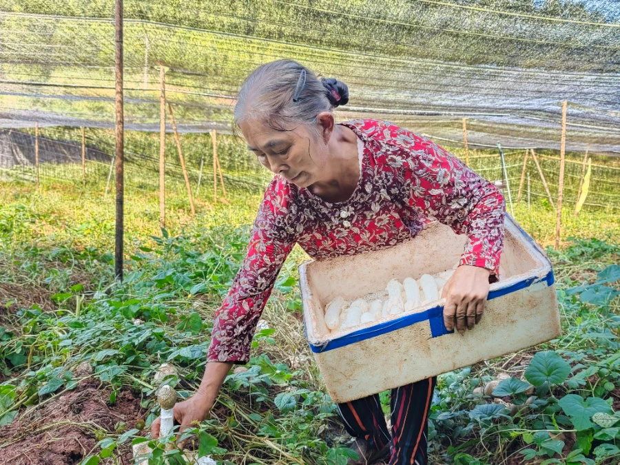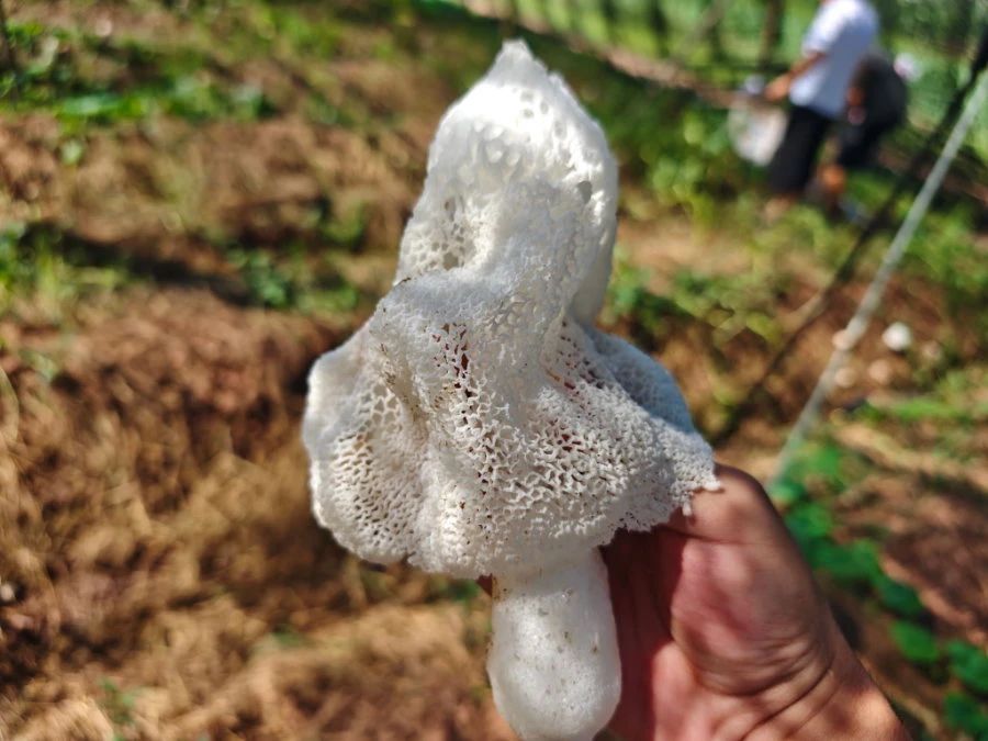 现场,村民们穿梭在大棚的田埂间,小心翼翼地采摘成熟的竹荪。“采摘竹荪得讲究技巧,手要轻,不能碰伤菌裙,不然就卖不上好价钱了。”村民李大姐一边说着,一边用指尖捏住竹荪菌柄底部,轻轻一旋,一株完整的竹荪便被采下。