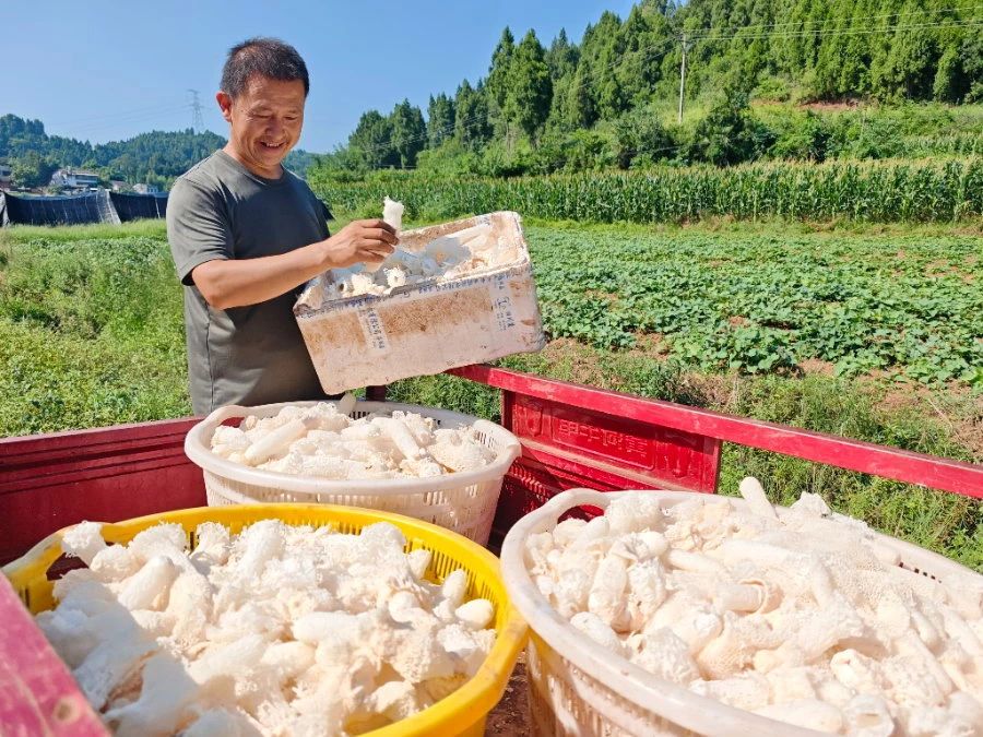 如今,宝塔村的竹荪种植面积达到了60余亩。在这丰收的季节,每天都能采收数百公斤的鲜竹荪,市场价格更是达到88元一斤。在离大棚不远的冻库,村民们正抓紧时间打理着刚采摘回来的竹荪,经过真空包装和冷链运输,竹荪当天就能送到成都、重庆等地消费者的餐桌上。“目前都是订单式销售,每天还没采摘就被订购一空。”邓先建介绍,去年宝塔村竹荪种植实现产值60万元,净利润20余万元,“我们计划把竹荪的种植面积扩大到100余亩,争取实现年产值500万元左右。”